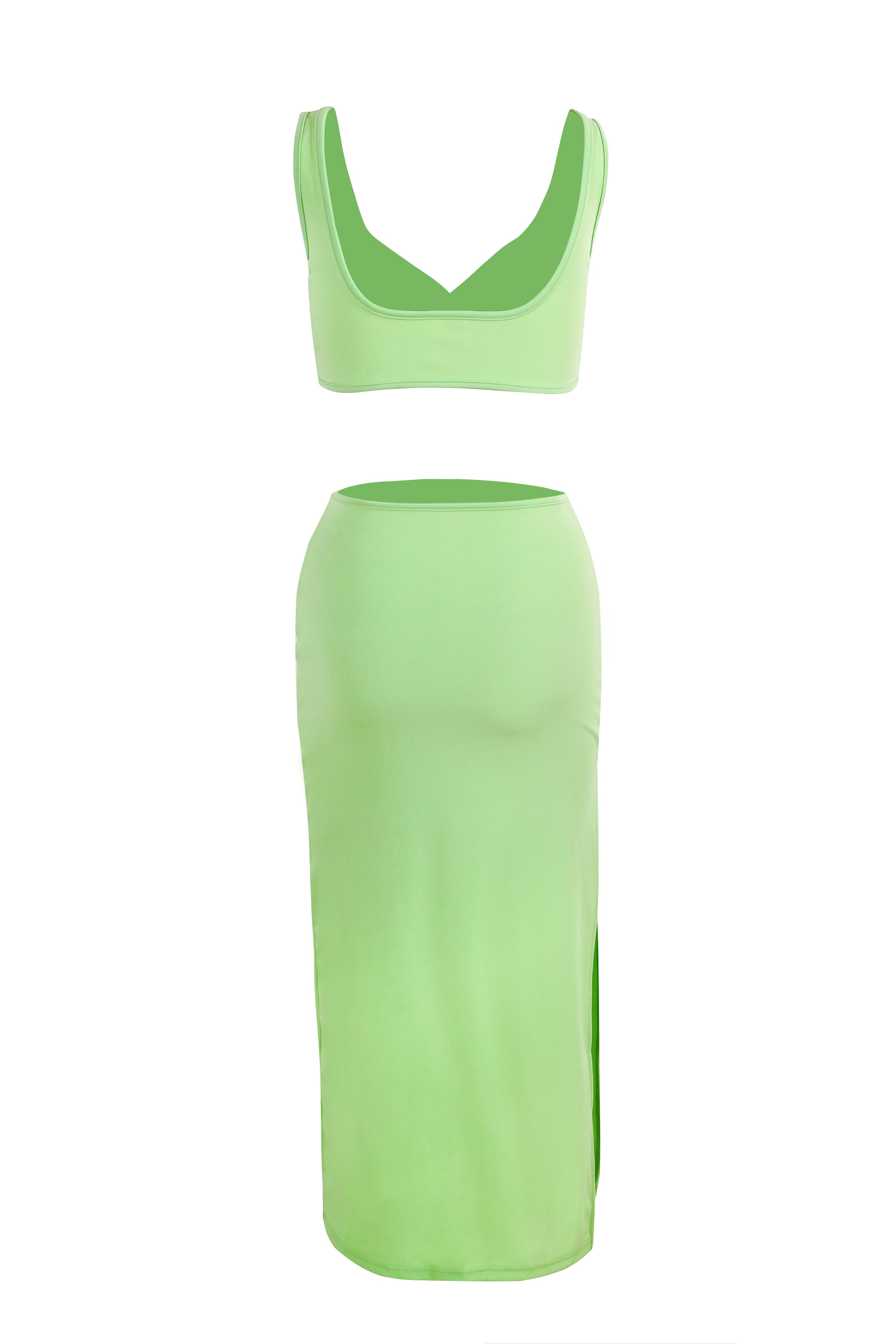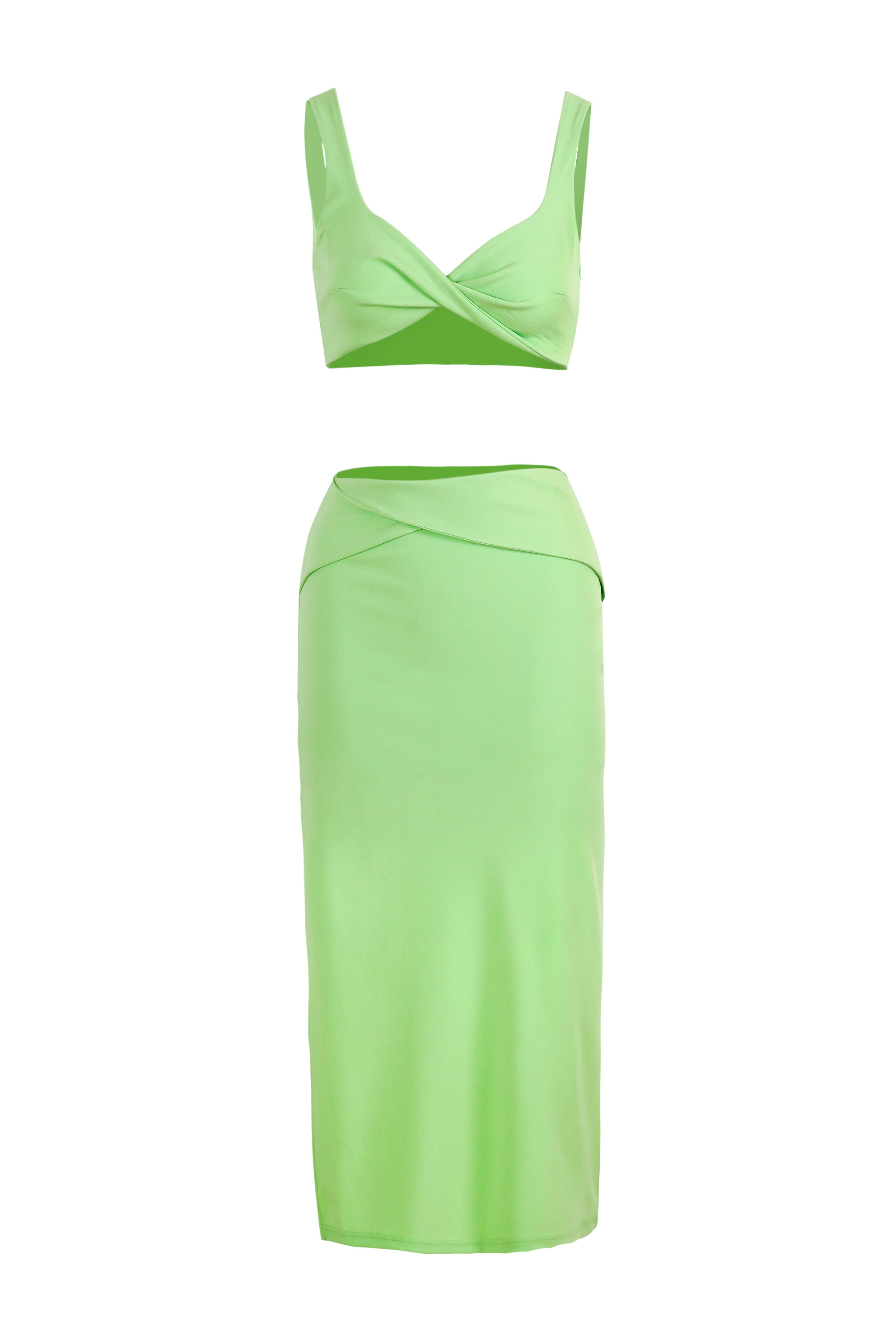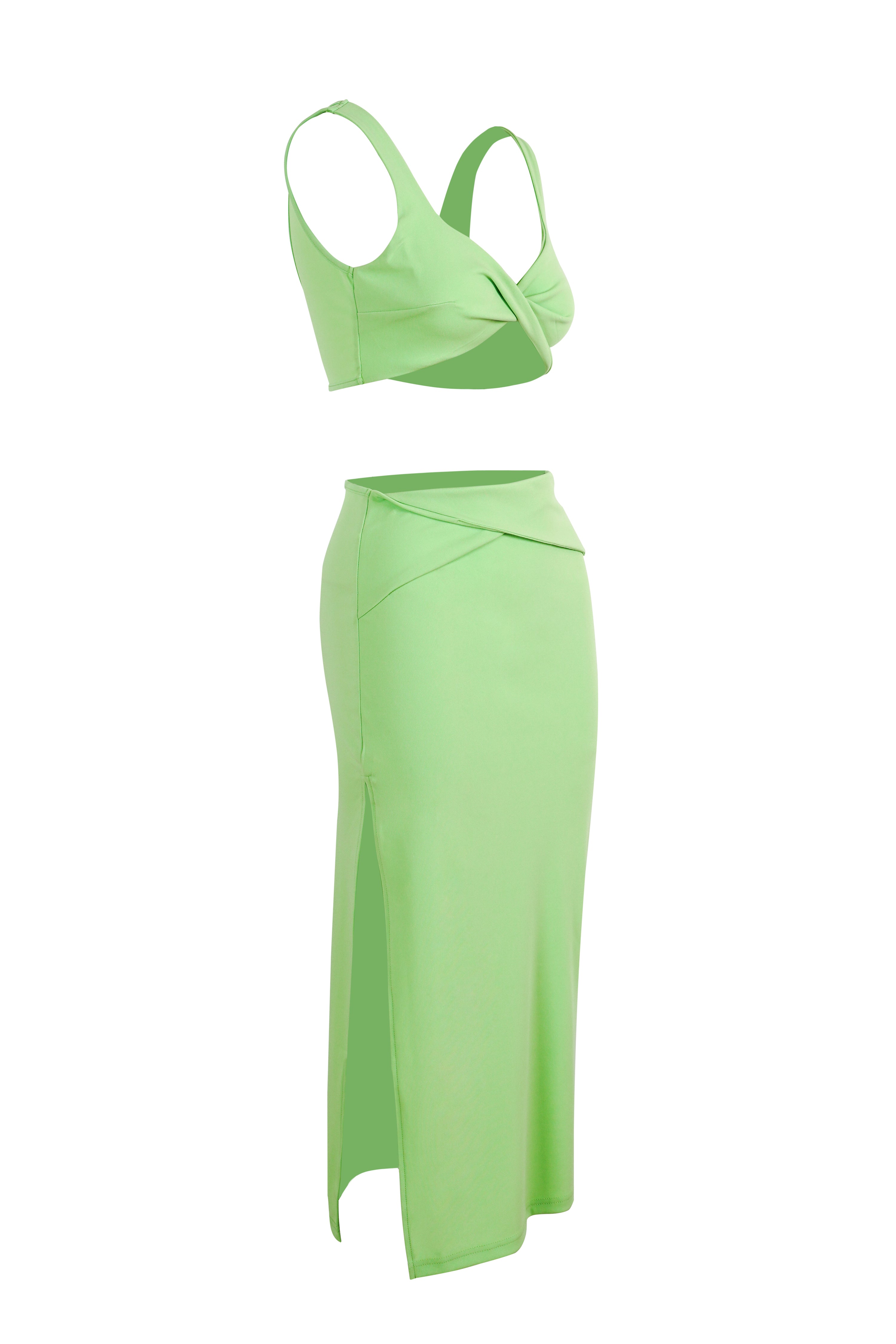 Green Crop Top With Split A-Line Dress Ruched Matching Set