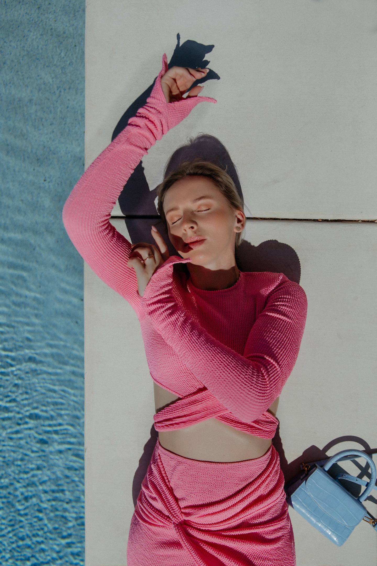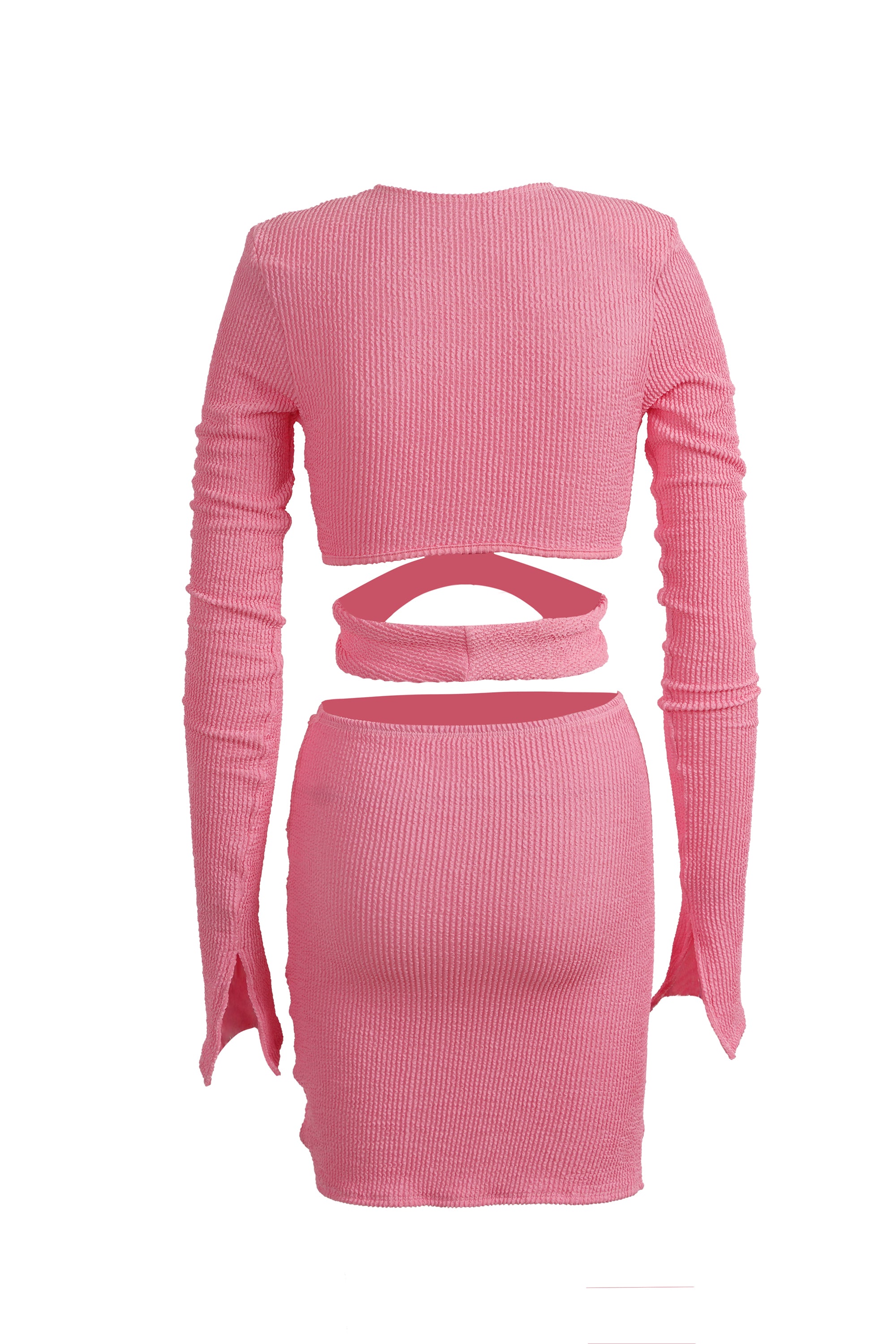 Solid Pink Long Bell Sleeve Two-piece Stretchable Dress
