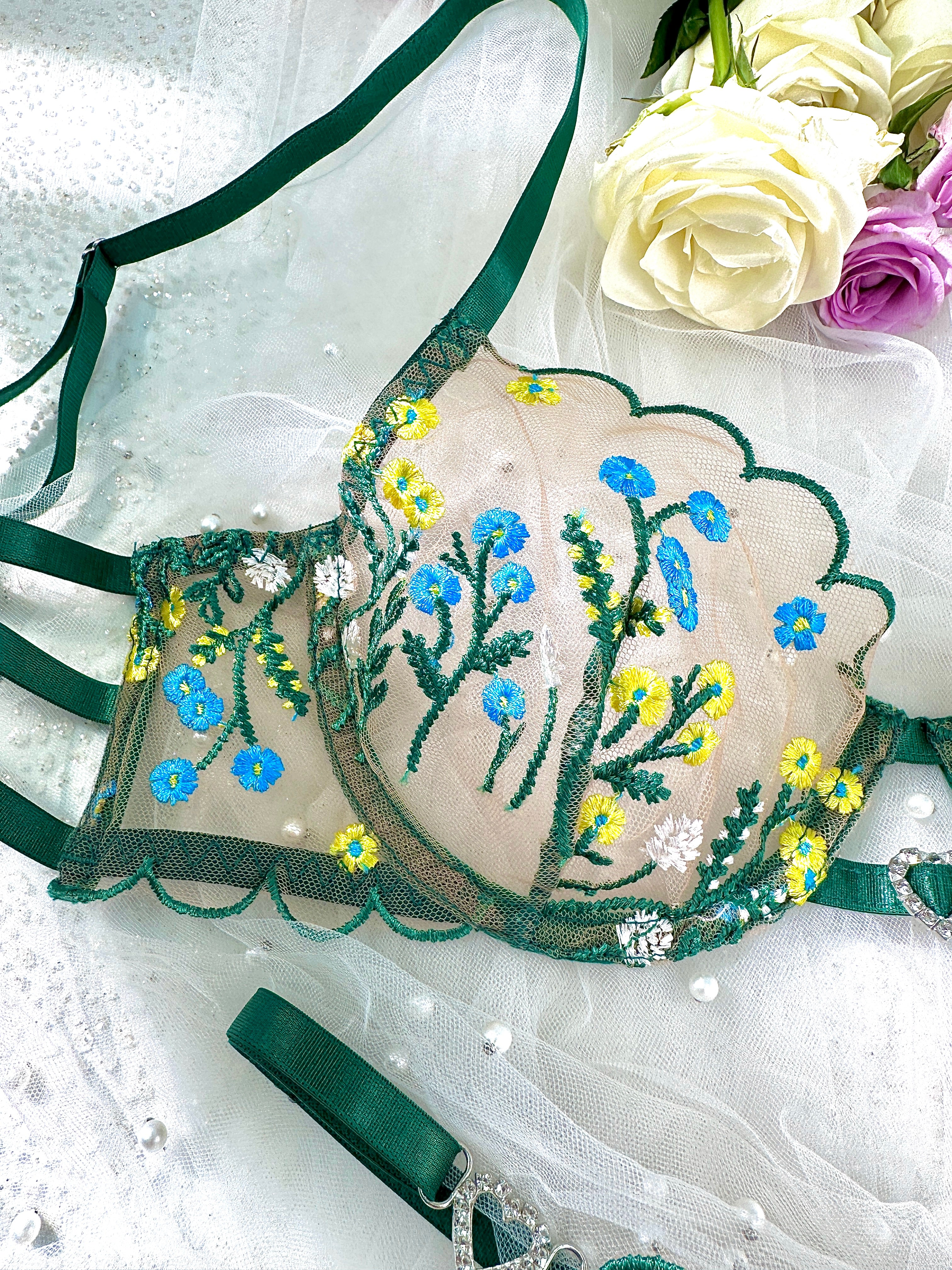 Elevate your elegance with the Elara Meadow Bloom Lingerie Set by Hello.LA.Girl. This delicate two-piece set features sheer nude mesh with green scalloped edges, adorned with vibrant yellow and blue floral embroidery for a fresh, natural look. Adjustable straps ensure a perfect fit, while subtle heart accents add a playful touch. Ideal for special nights or whenever you want to feel effortlessly confident and alluring.