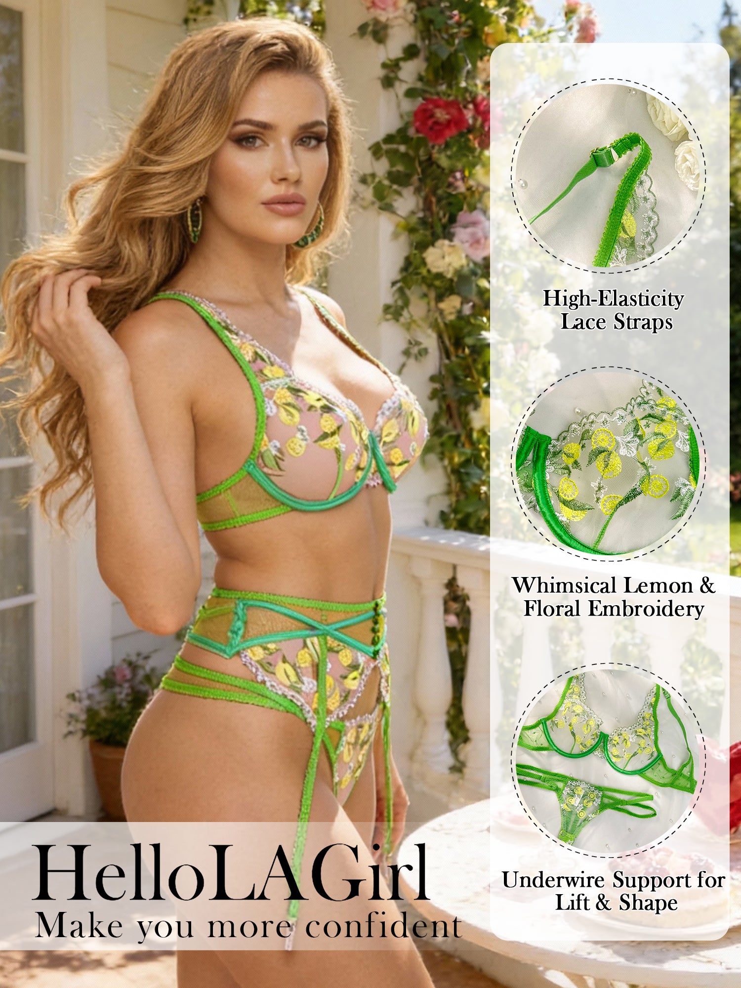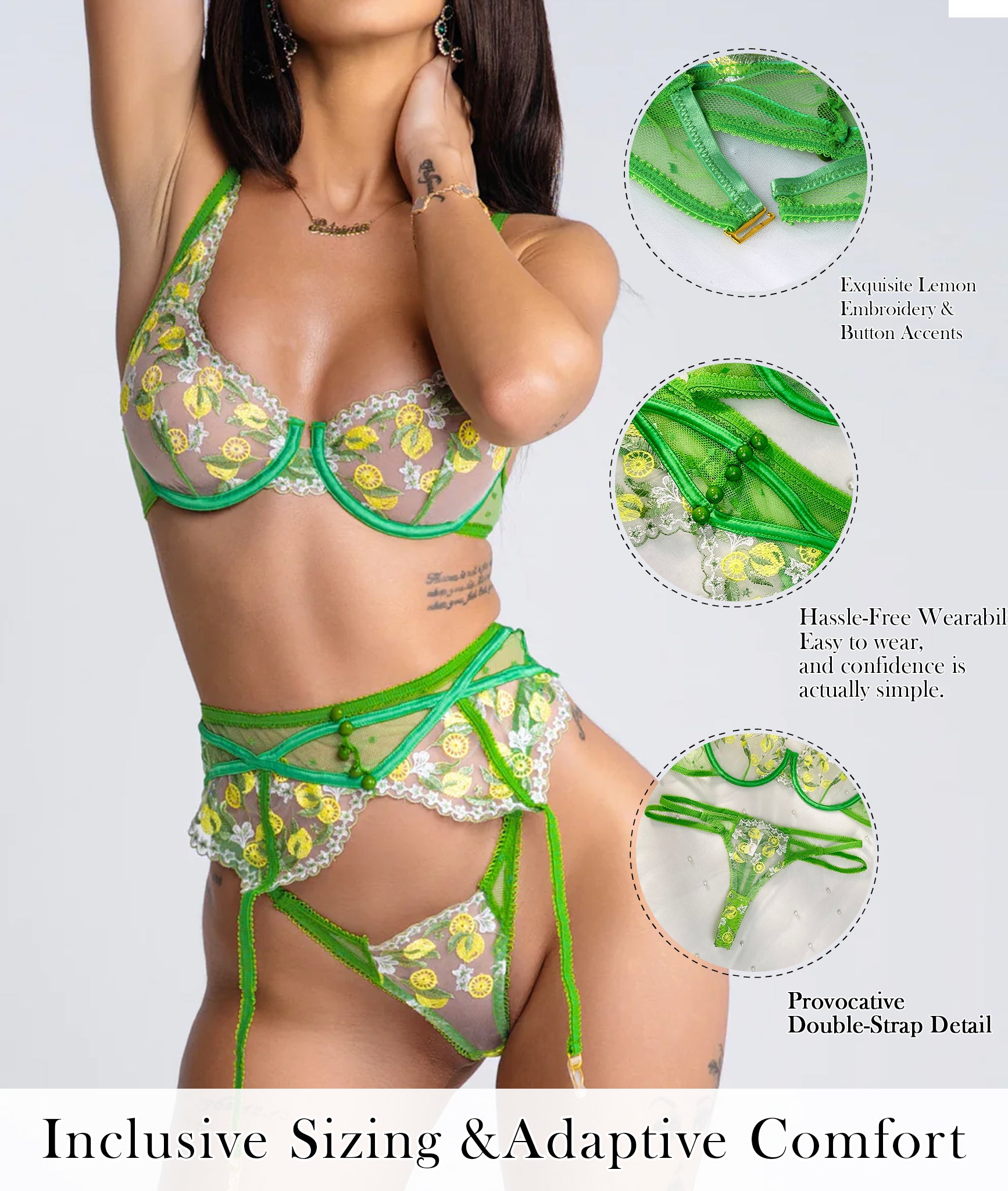 Embrace vibrant charm with the Fresh Lemon Embroidery Lingerie Set. 💚 The lively lemon hue and intricate embroidery capture a refreshing elegance, while the delicate details add a touch of playful sophistication. This set transforms every moment into a radiant expression of beauty and artistry.✨