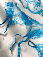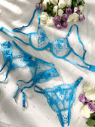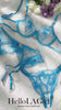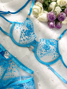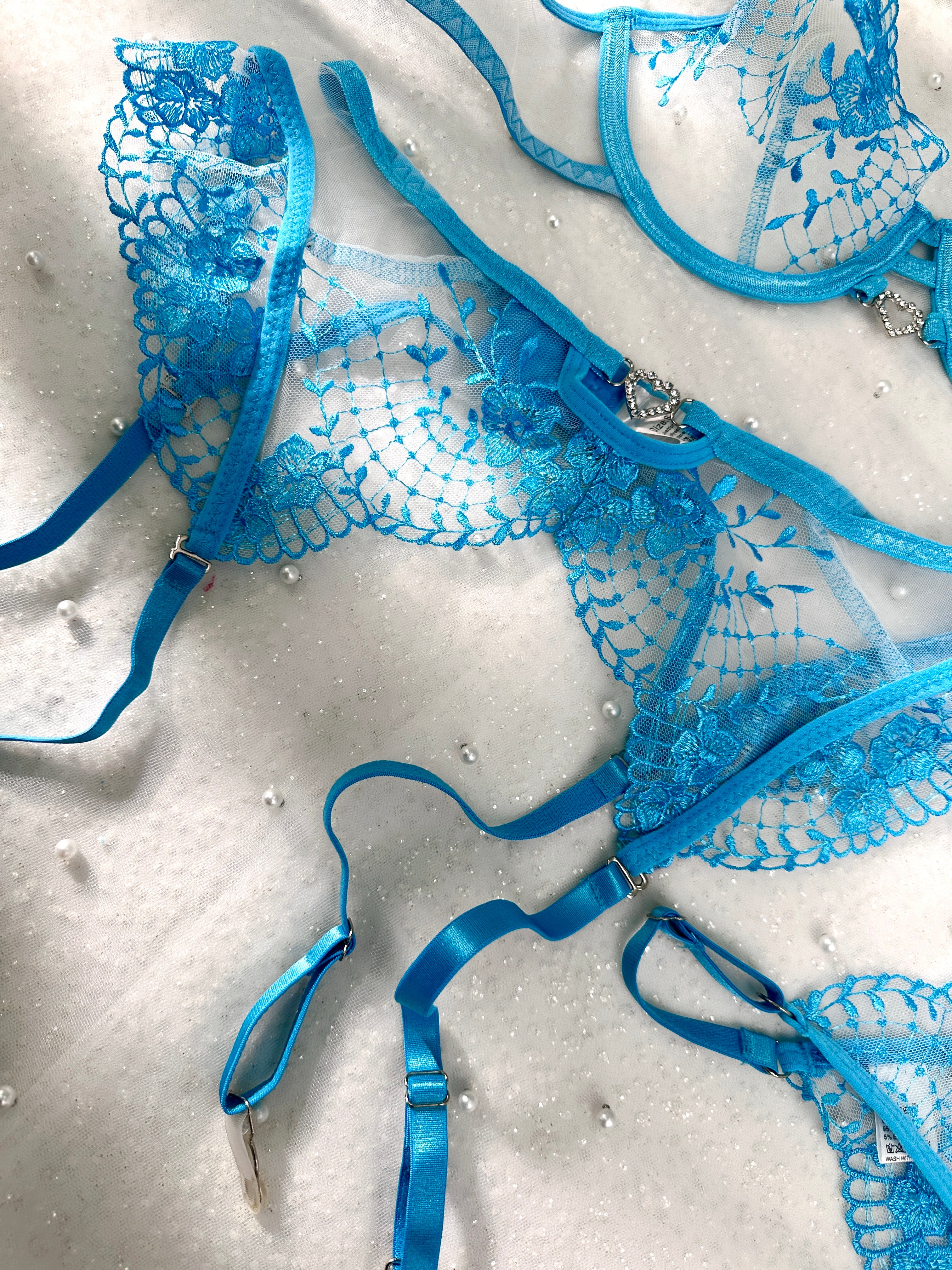 Indulge in elegance and allure with the Aqua Blossom Lace Lingerie Set by Hello.LA.Girl. This three-piece set features a sheer mesh bra, matching high-waist panties, and a delicate garter belt, all adorned with intricate floral embroidery. The vibrant aqua hue enhances your natural glow, while the heart-shaped accents add a flirty, romantic touch. Adjustable straps ensure a perfect fit, making this set ideal for special moments or to feel confident and empowered every day.