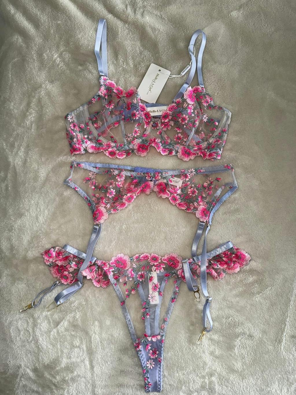 This lingerie masterpiece features vibrant pink floral embroidery that radiates with a passionate allure, elegantly paired with soft lavender straps and trims. The delicate lavender pendants add a touch of whimsical charm, creating a harmonious blend of bold color and gentle sophistication. Each detail weaves a story of romance and elegance, making this piece a captivating celebration of sensuality.🌸💜