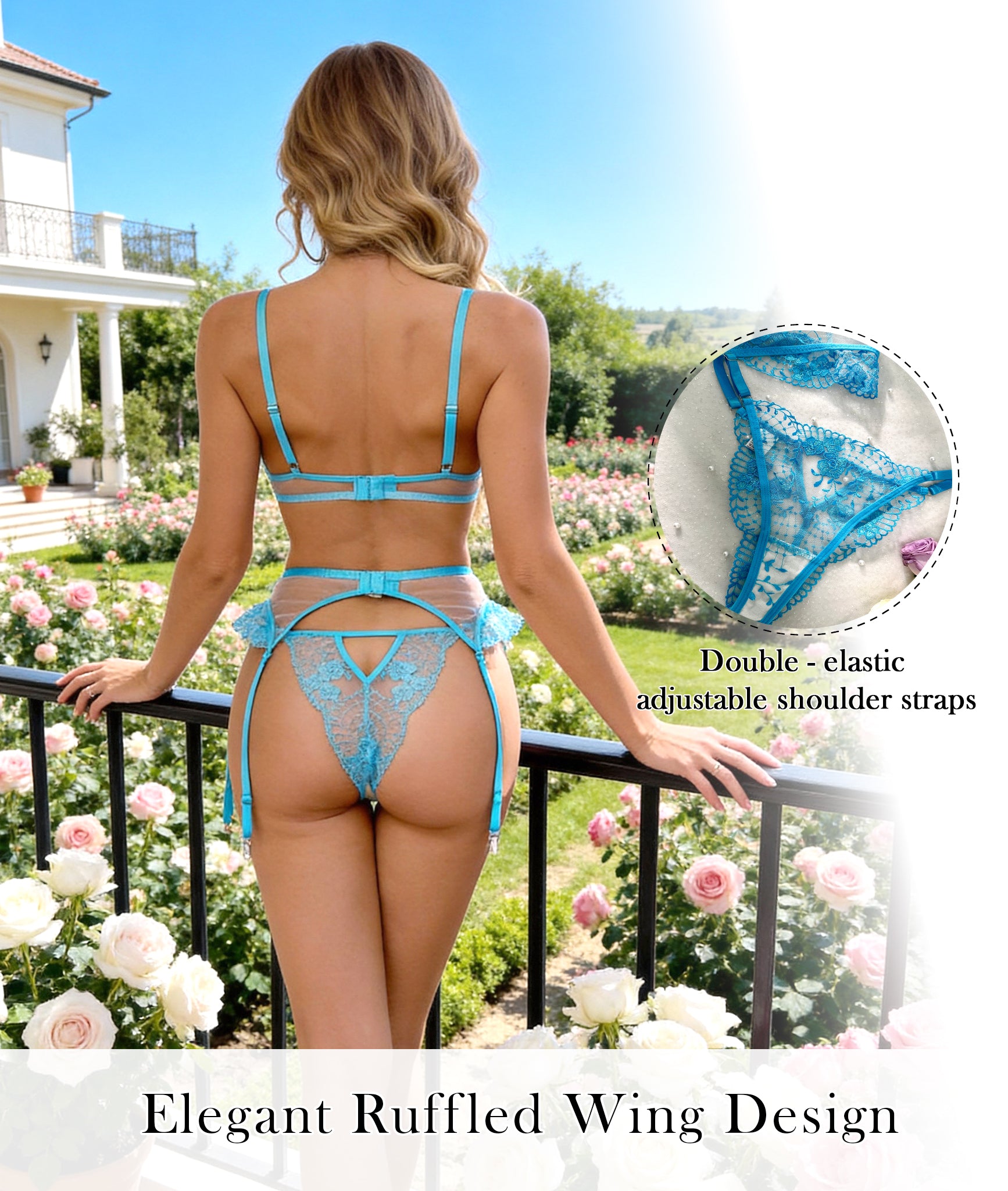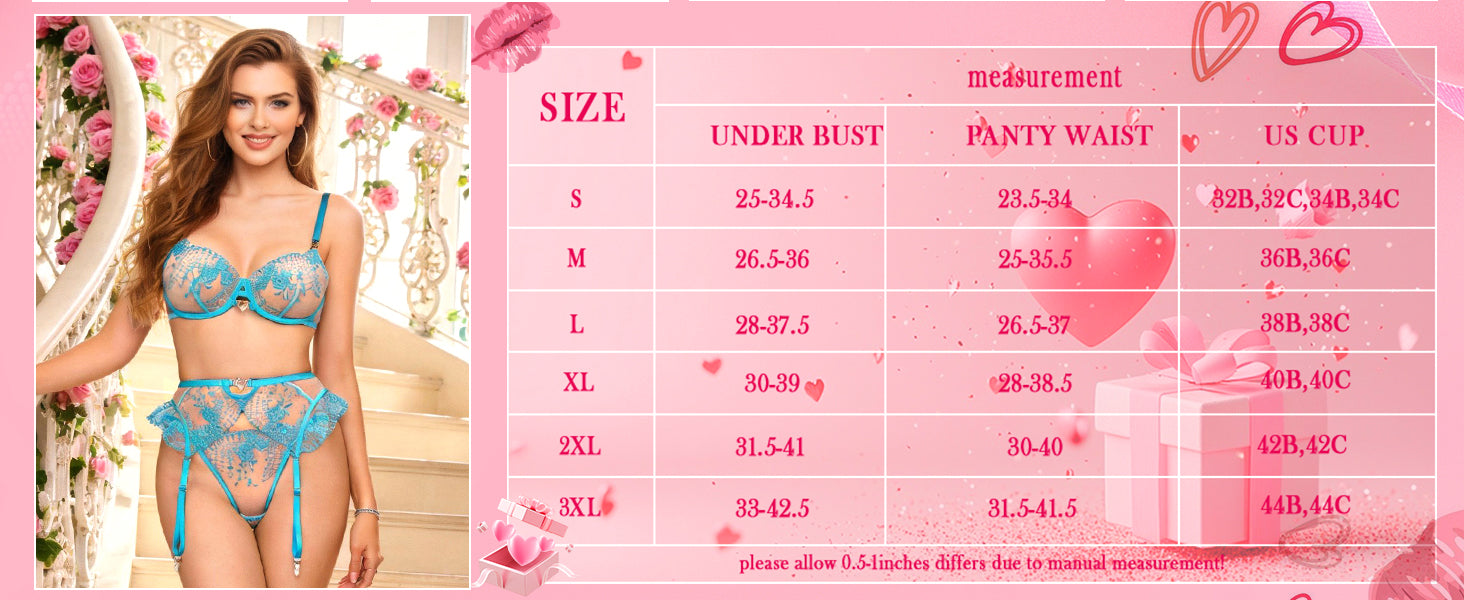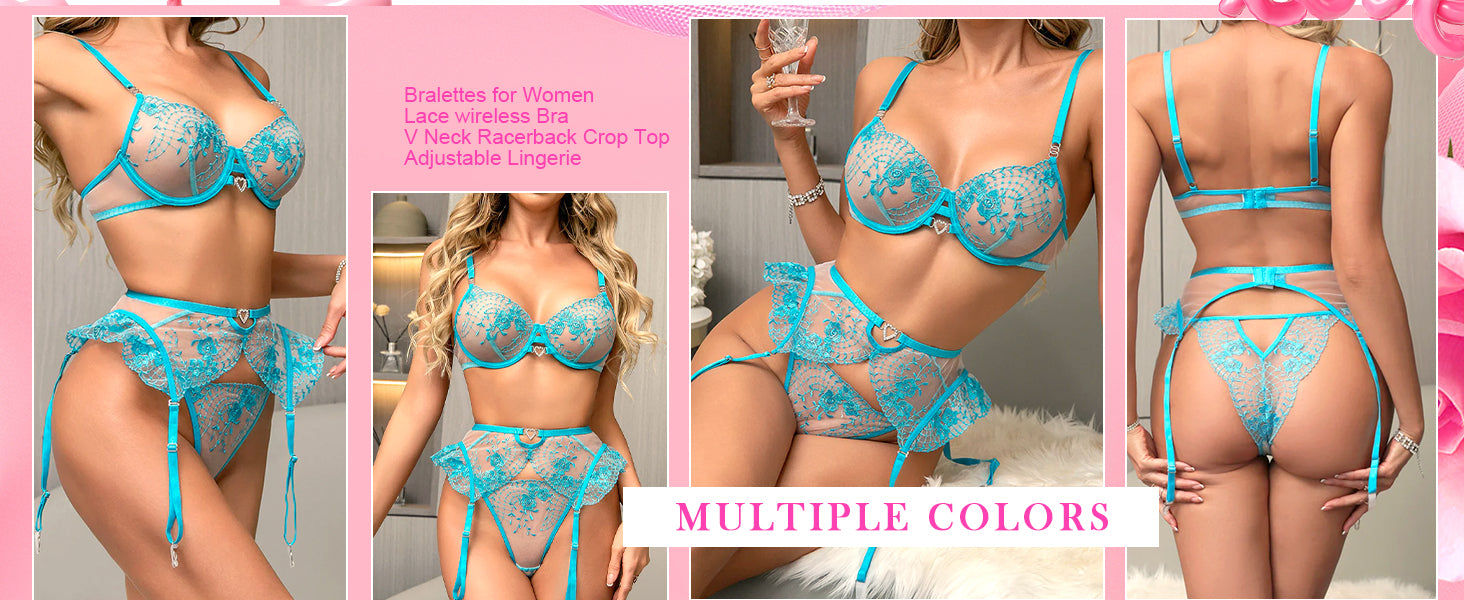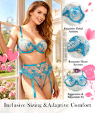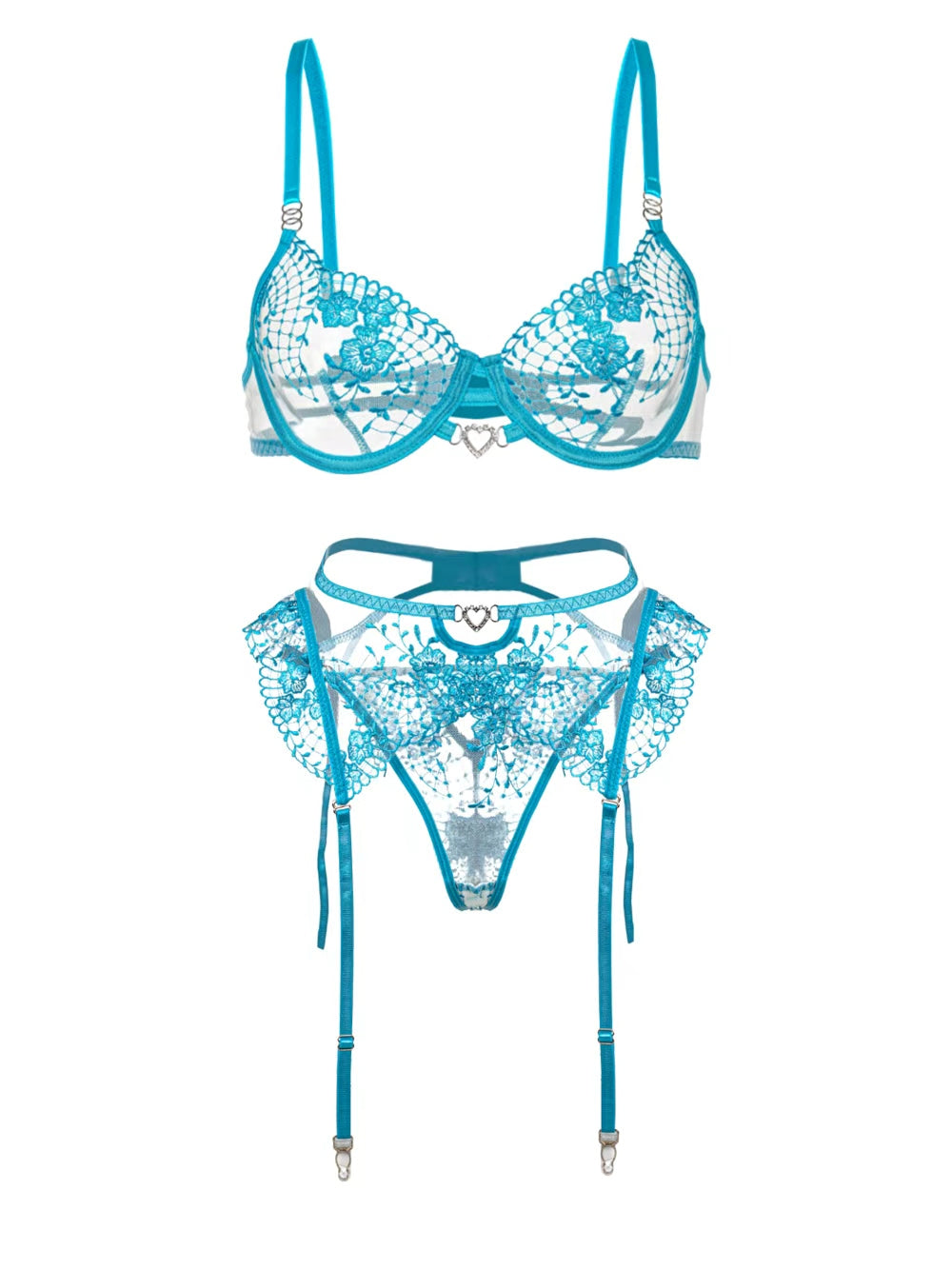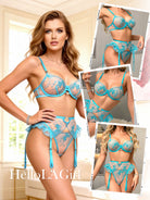 Indulge in elegance and allure with the Aqua Blossom Lace Lingerie Set by Hello.LA.Girl. This three-piece set features a sheer mesh bra, matching high-waist panties, and a delicate garter belt, all adorned with intricate floral embroidery. The vibrant aqua hue enhances your natural glow, while the heart-shaped accents add a flirty, romantic touch. Adjustable straps ensure a perfect fit, making this set ideal for special moments or to feel confident and empowered every day.