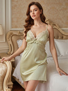 Elevate your loungewear game with this sage-green satin nightgown—where luxury texture meets romantic design, perfect for cozy, stylish evenings.