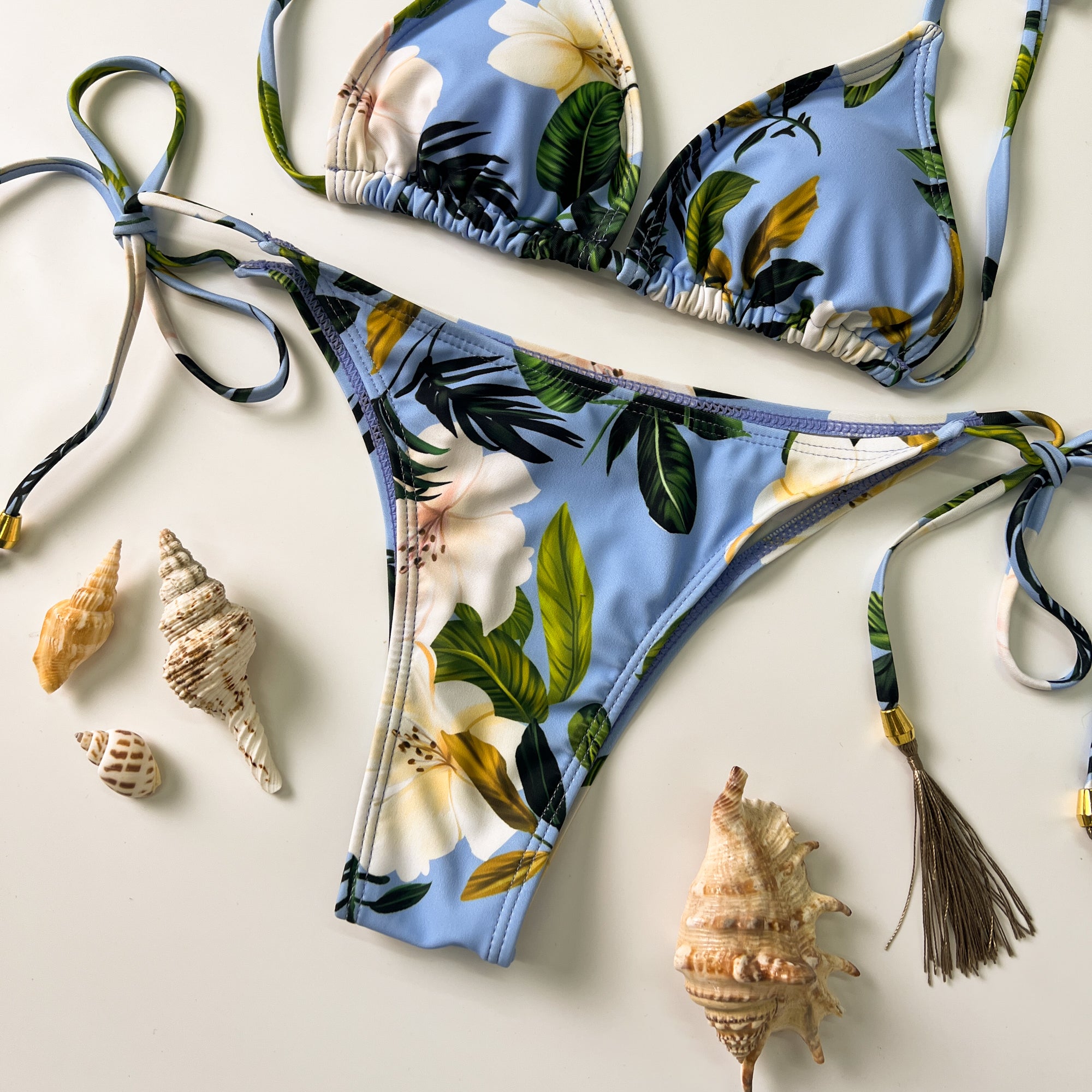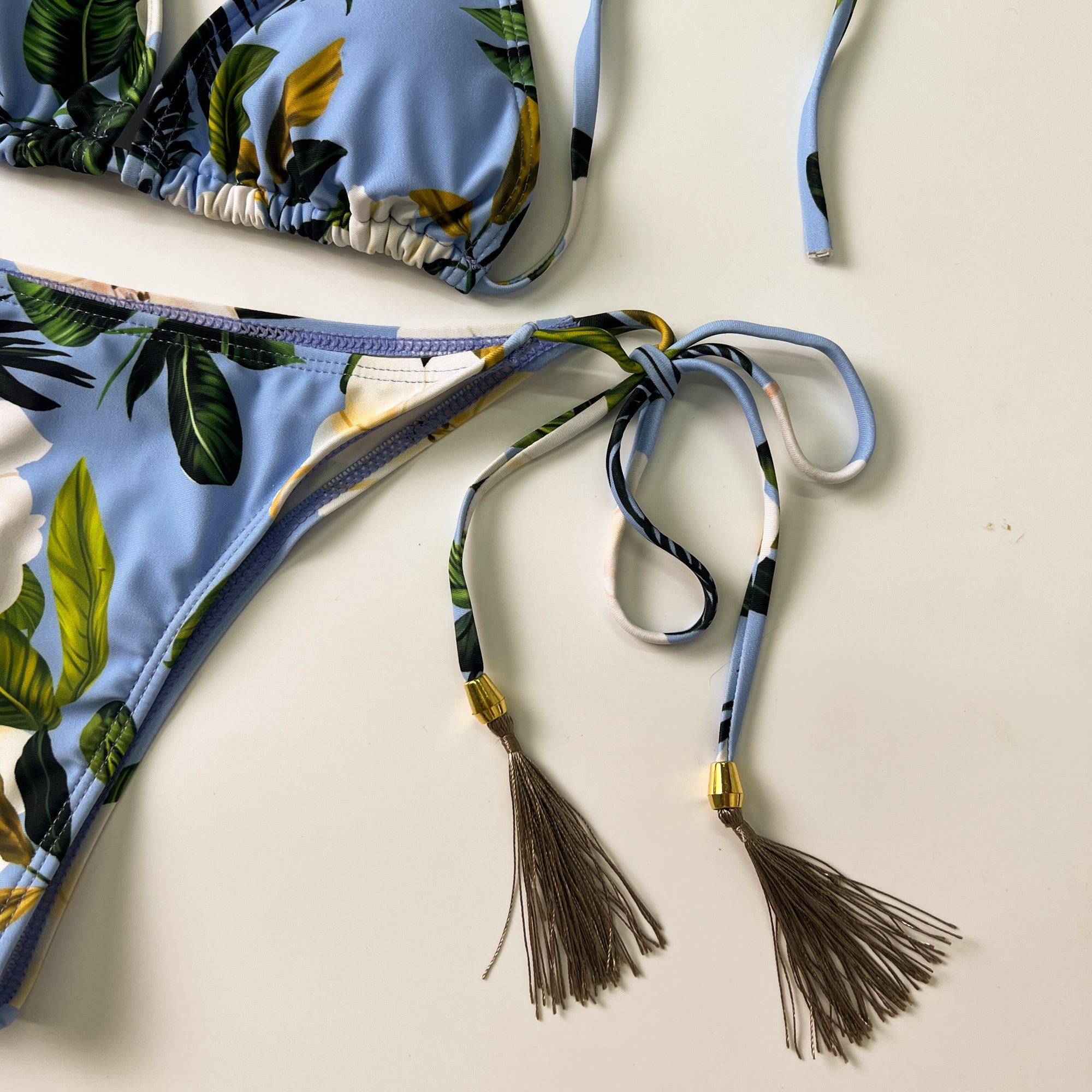This Blue Floral Print Lace Up Bikini Set is made of 100% Acrylic.