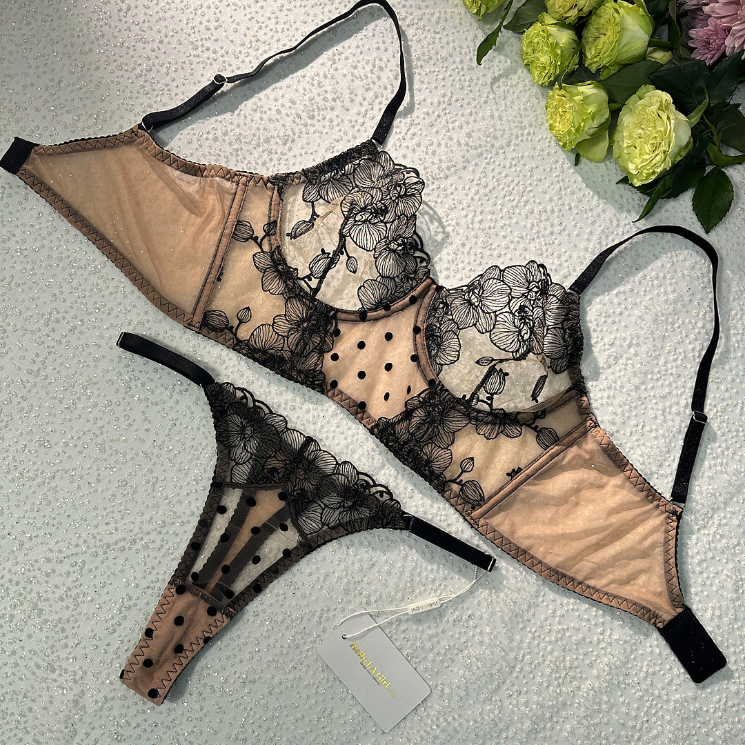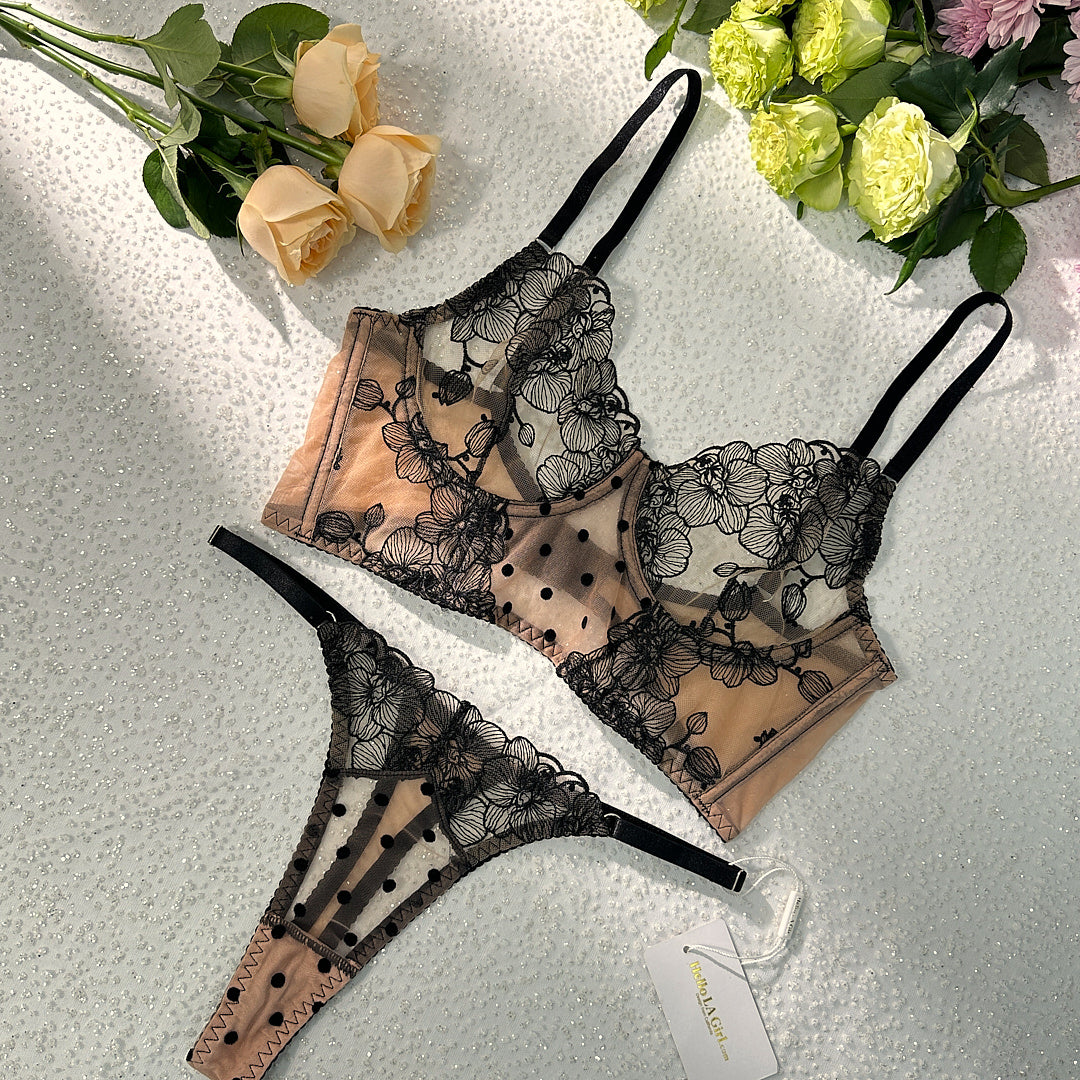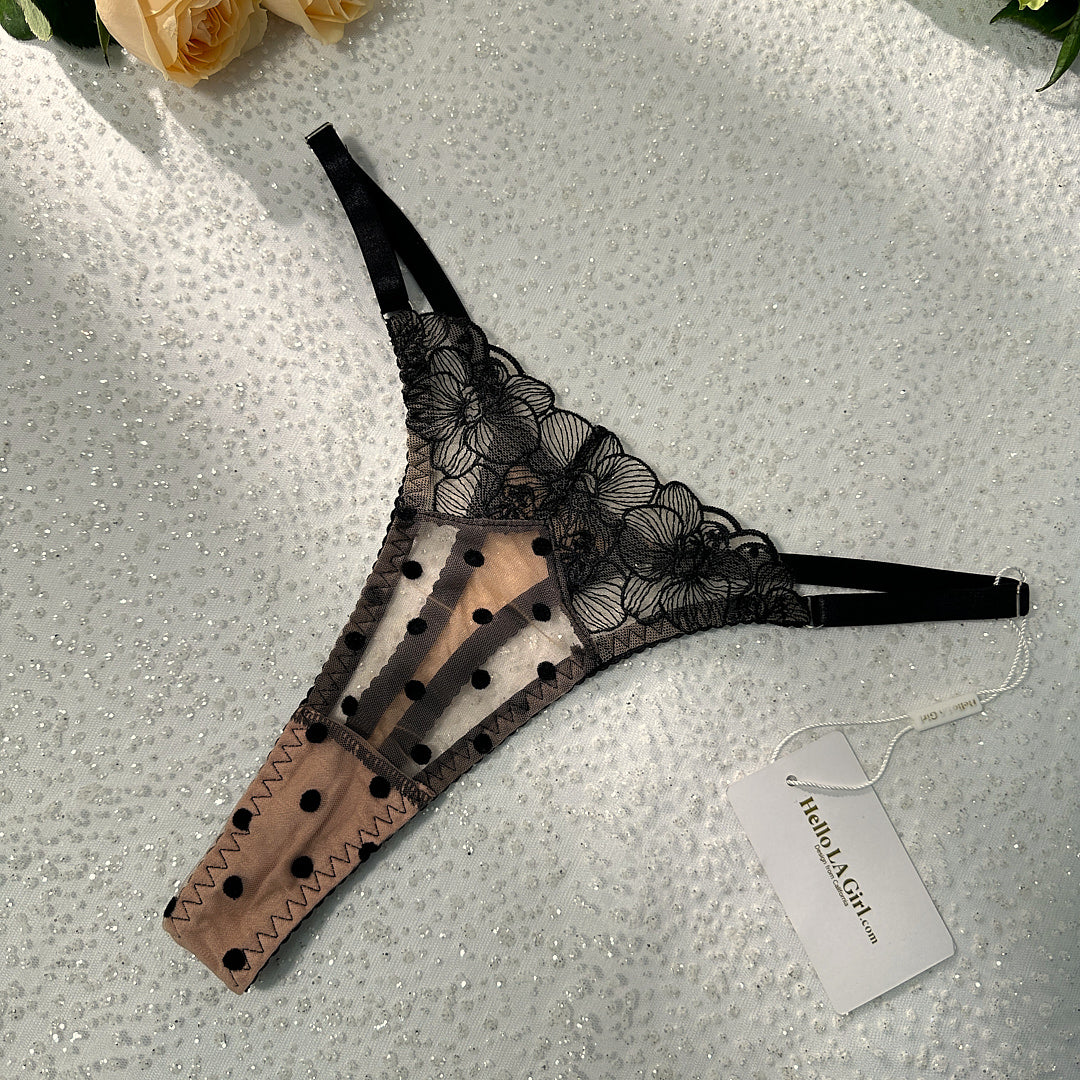 Elevate your intimate wardrobe with this  2-piece lingerie set, blending delicate sheer nude mesh, bold black floral embroidery, and playful polka dot accents. The bralette features adjustable straps and a form-fitting design, while the matching thong offers a cheeky, high-cut silhouette—perfect for balancing romance and edge.