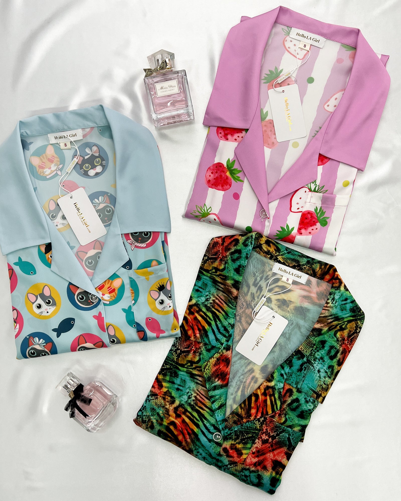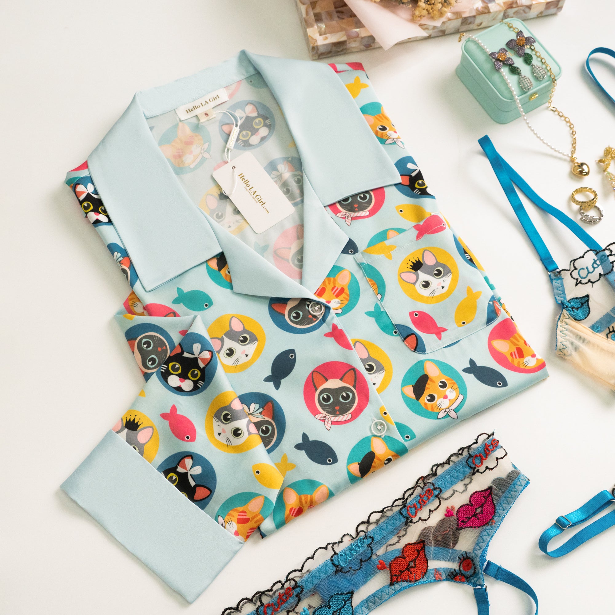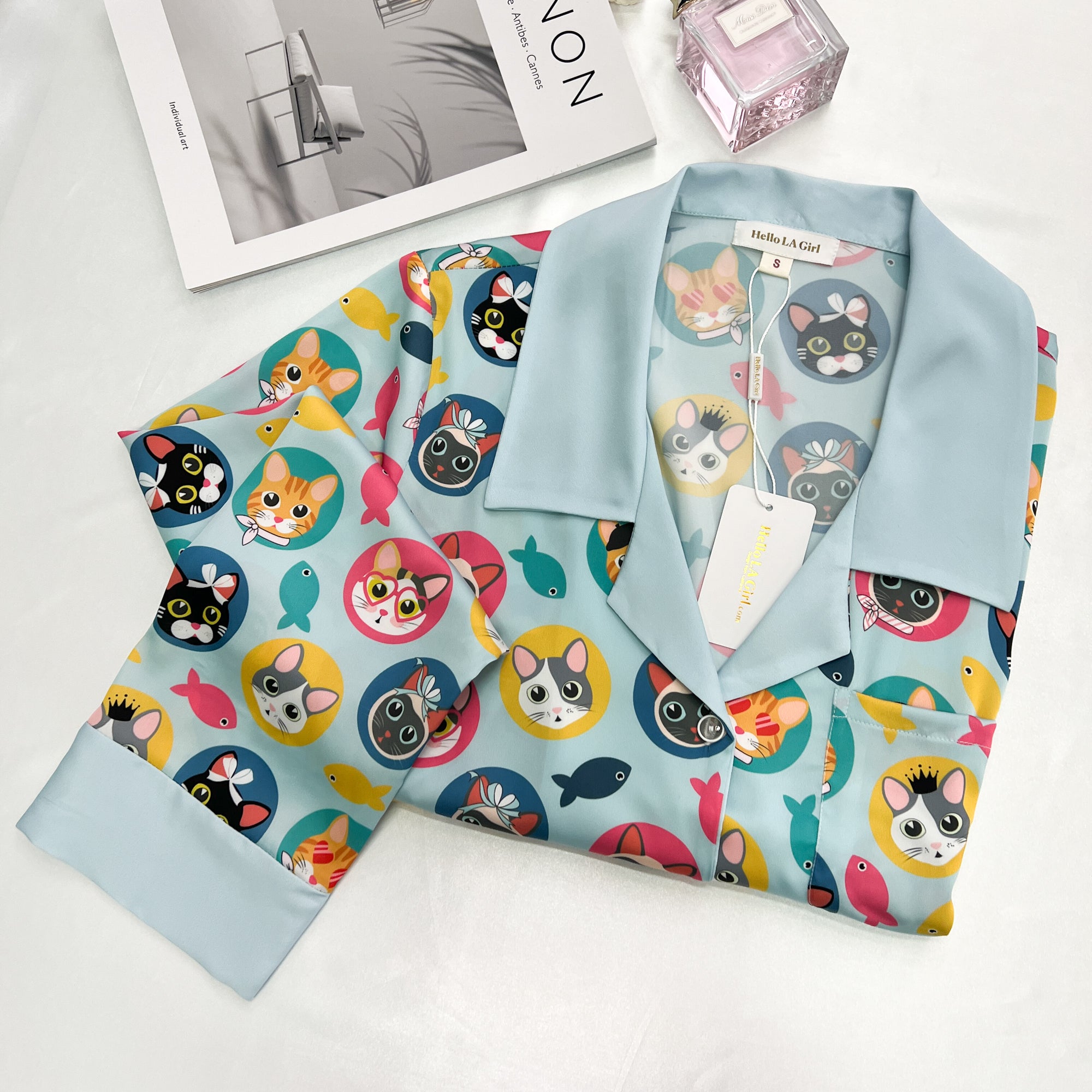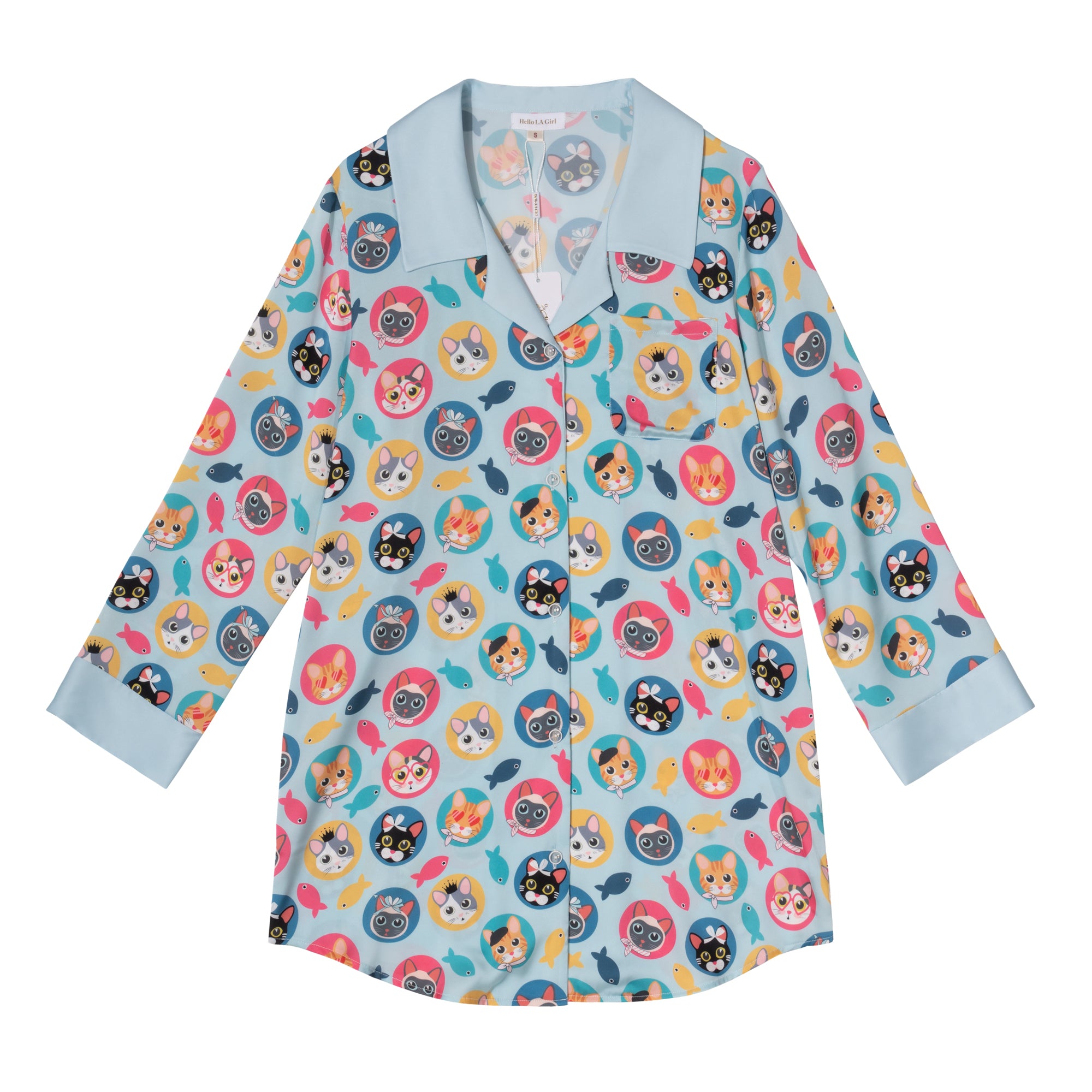 Cats Print Blue Sleep Shirt Silky Satin Pajamas Sleepshirt is made of 100% Polyester.