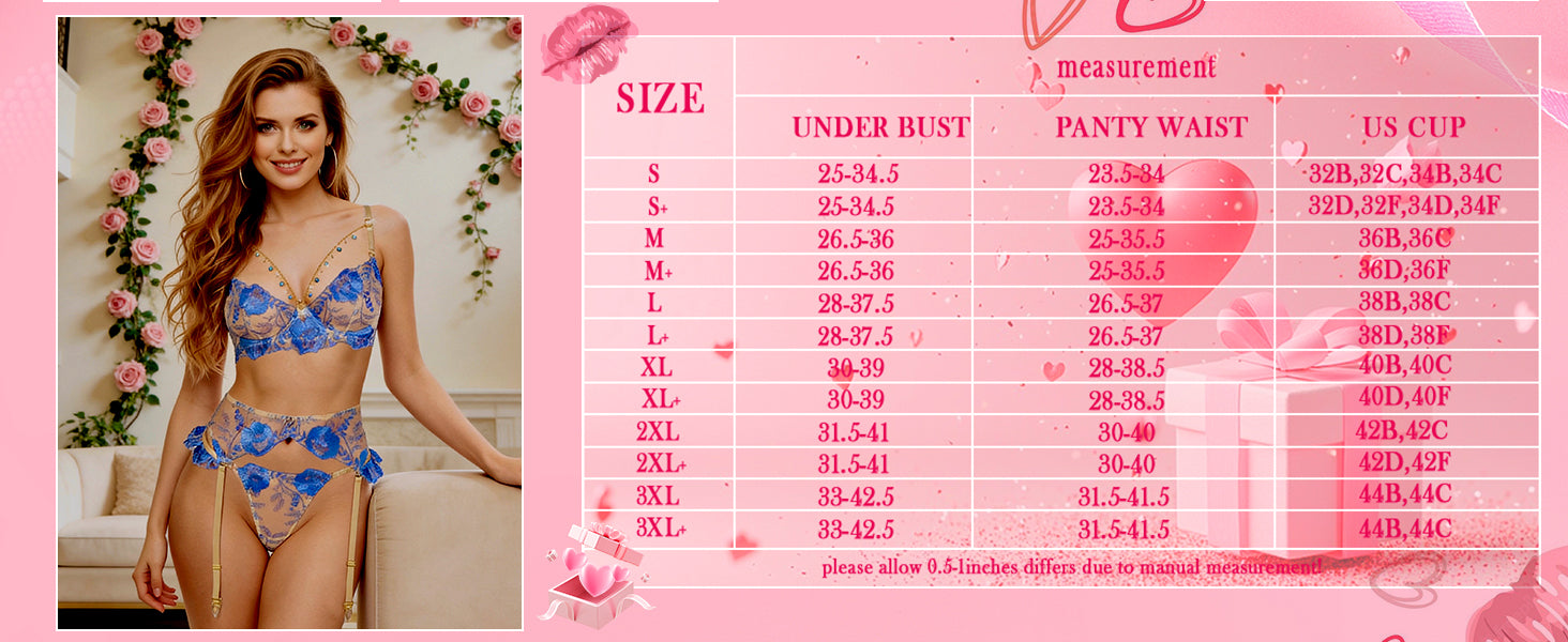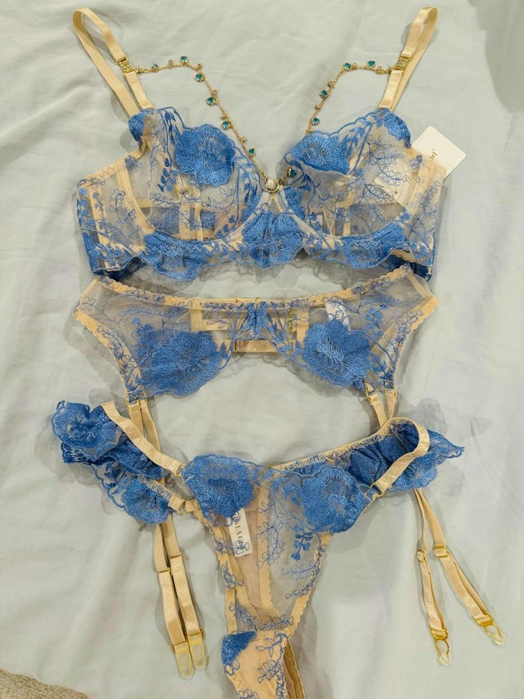 Elevate your lingerie collection with the Azure Bloom Chain-Detail Embroidered Lingerie Set, a stunning blend of delicate mesh, vivid blue floral embroidery, and luxurious chain accents. Designed to celebrate confidence and elegance, this three-piece set includes an underwire bra, a sculpting high-waist garter belt, and a matching embroidered panty.