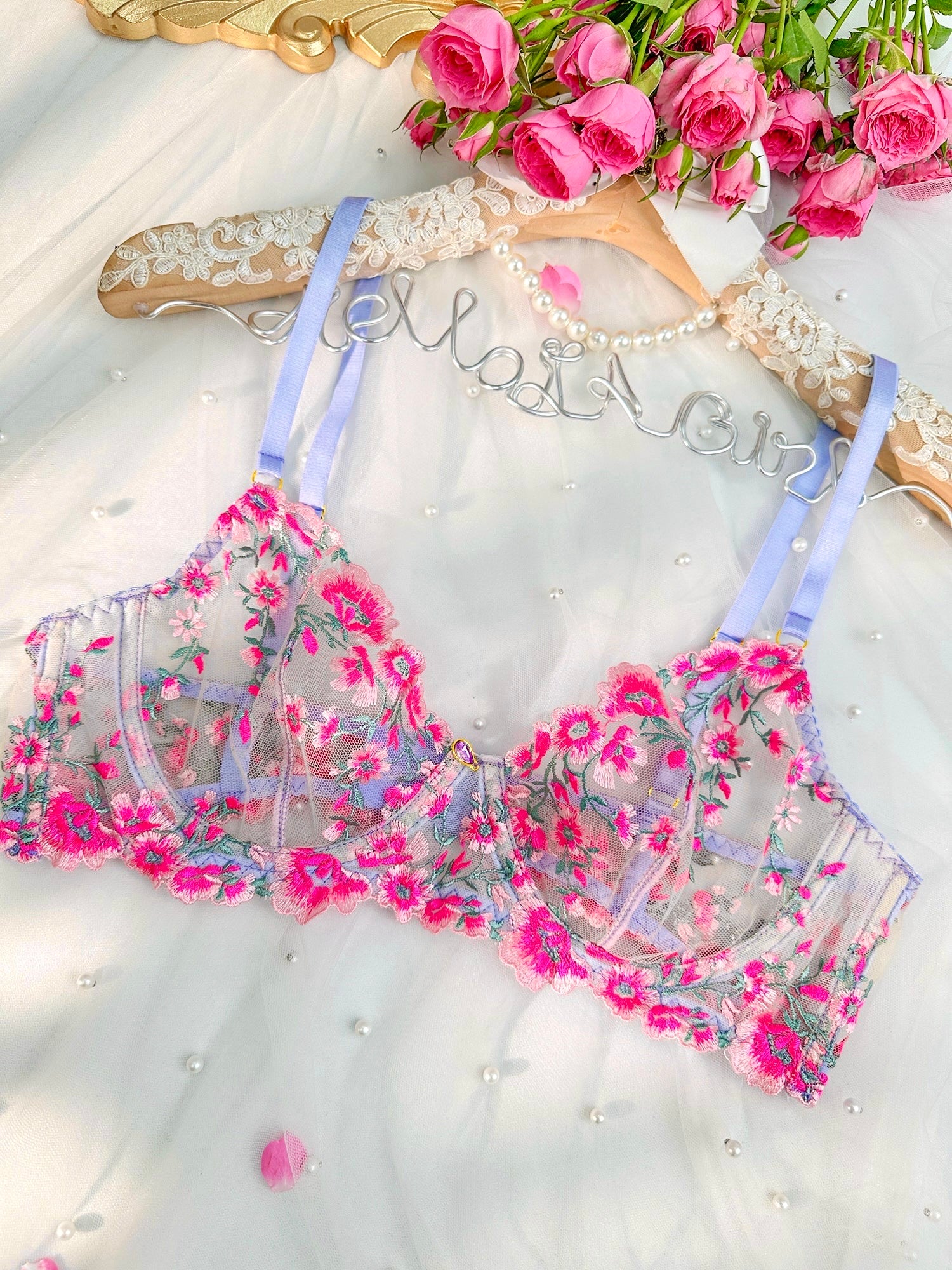 Ce chef-d'œuvre de lingerie présente une broderie florale rose vibrante qui rayonne d'une allure passionnée, élégamment associée à des bretelles et des bordures lavande douces. Les délicats pendentifs lavande ajoutent une touche de charme fantaisiste, créant un mélange harmonieux de couleurs vives et de sophistication douce. Chaque détail tisse une histoire de romantisme et d'élégance, faisant de cette pièce une célébration captivante de la sensualité.🌸💜