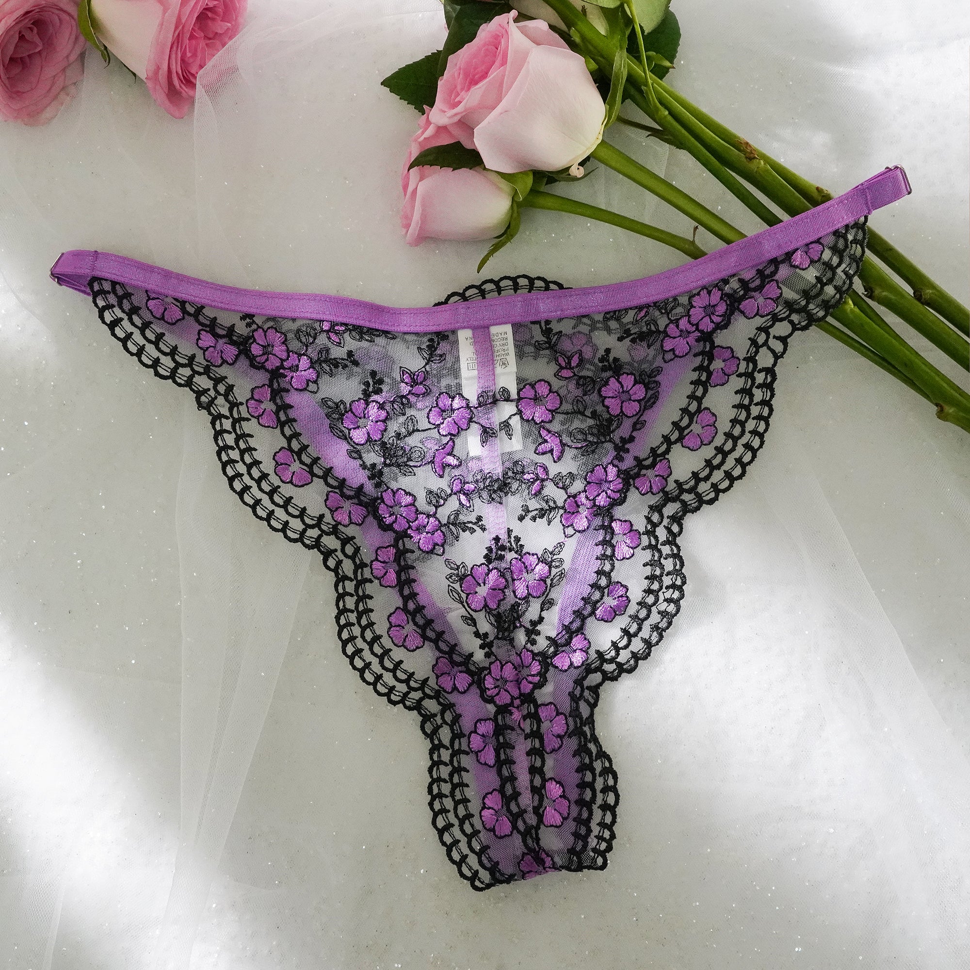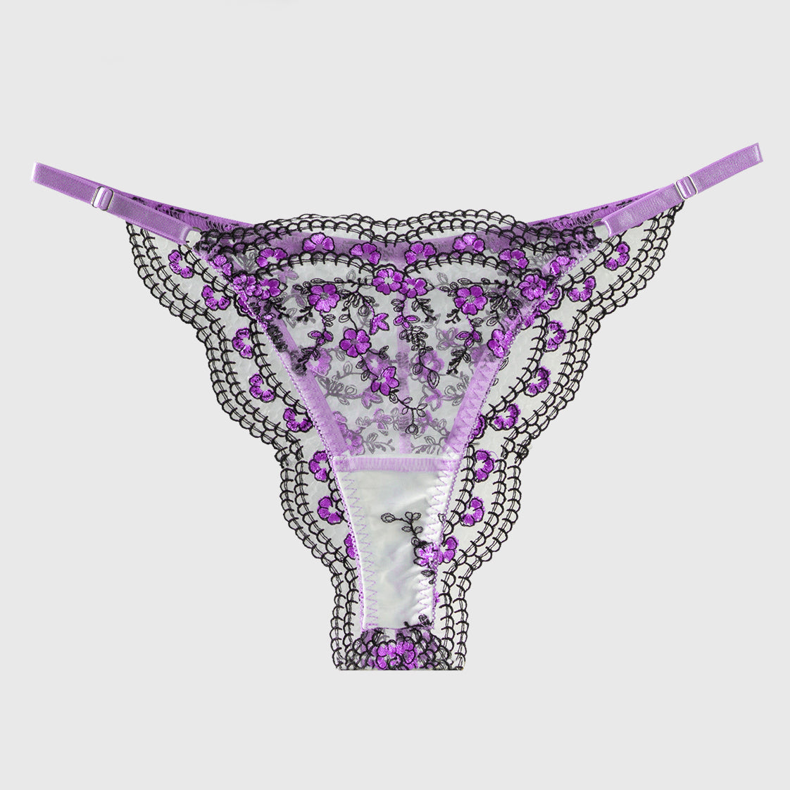 String brodé de fleurs violettes/bleues avec bordure noire