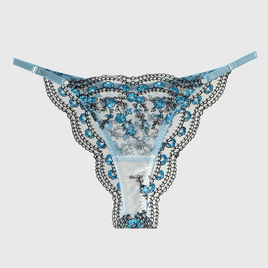 Ce string à bordure noire brodée est composé à 95 % de polyester et à 5 % d'élasthanne.