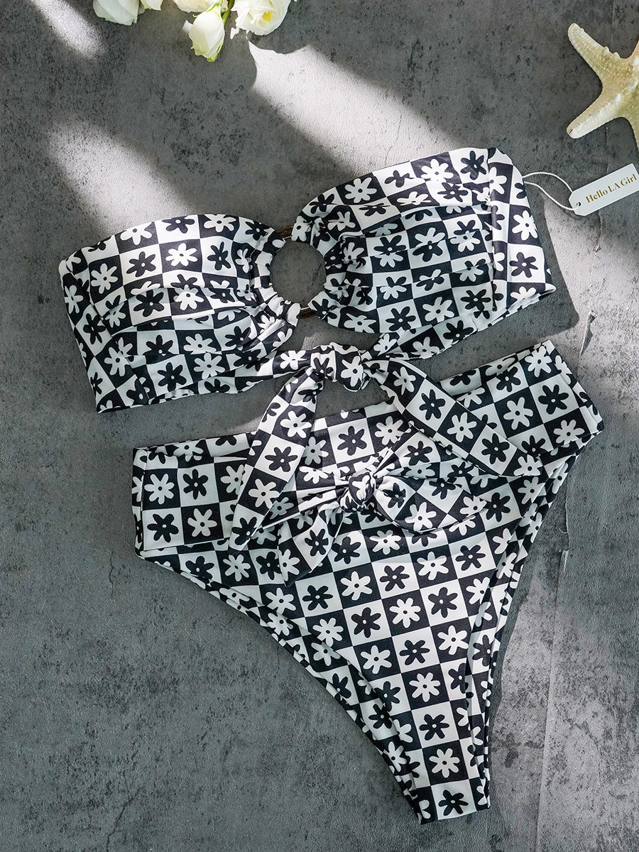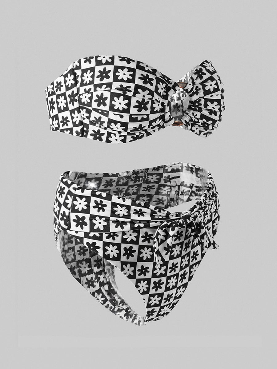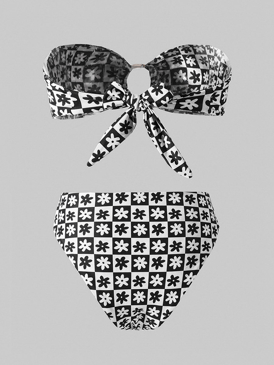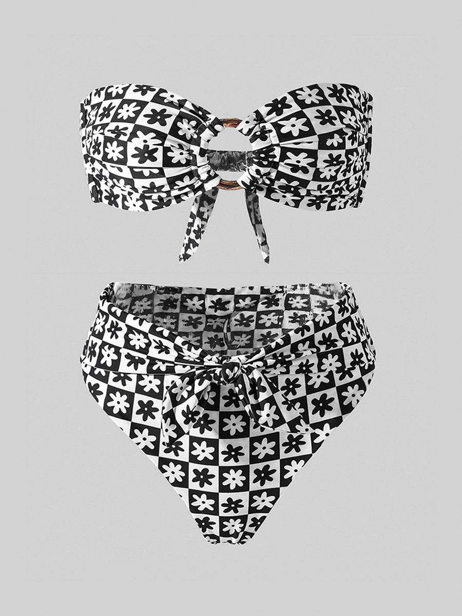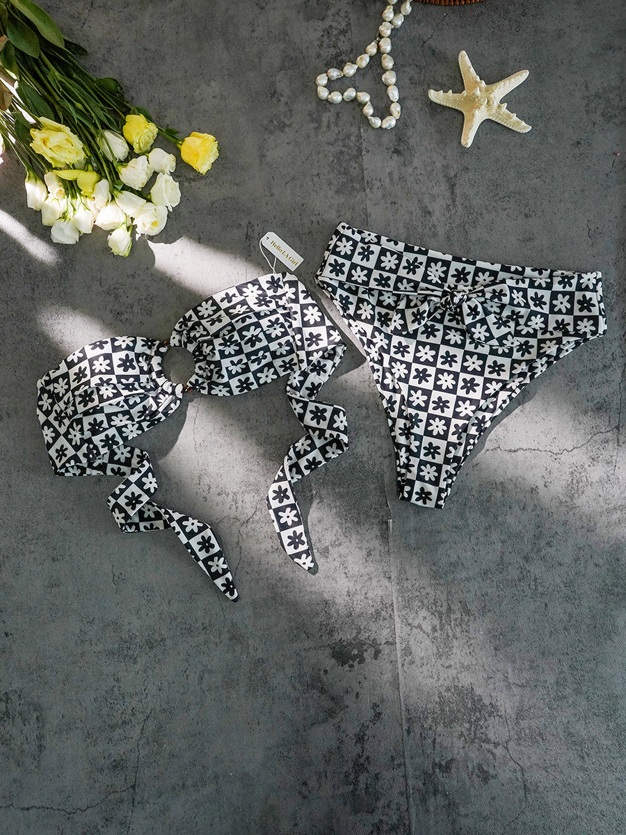 Ensemble bikini taille haute double épaisseur carré noir et blanc