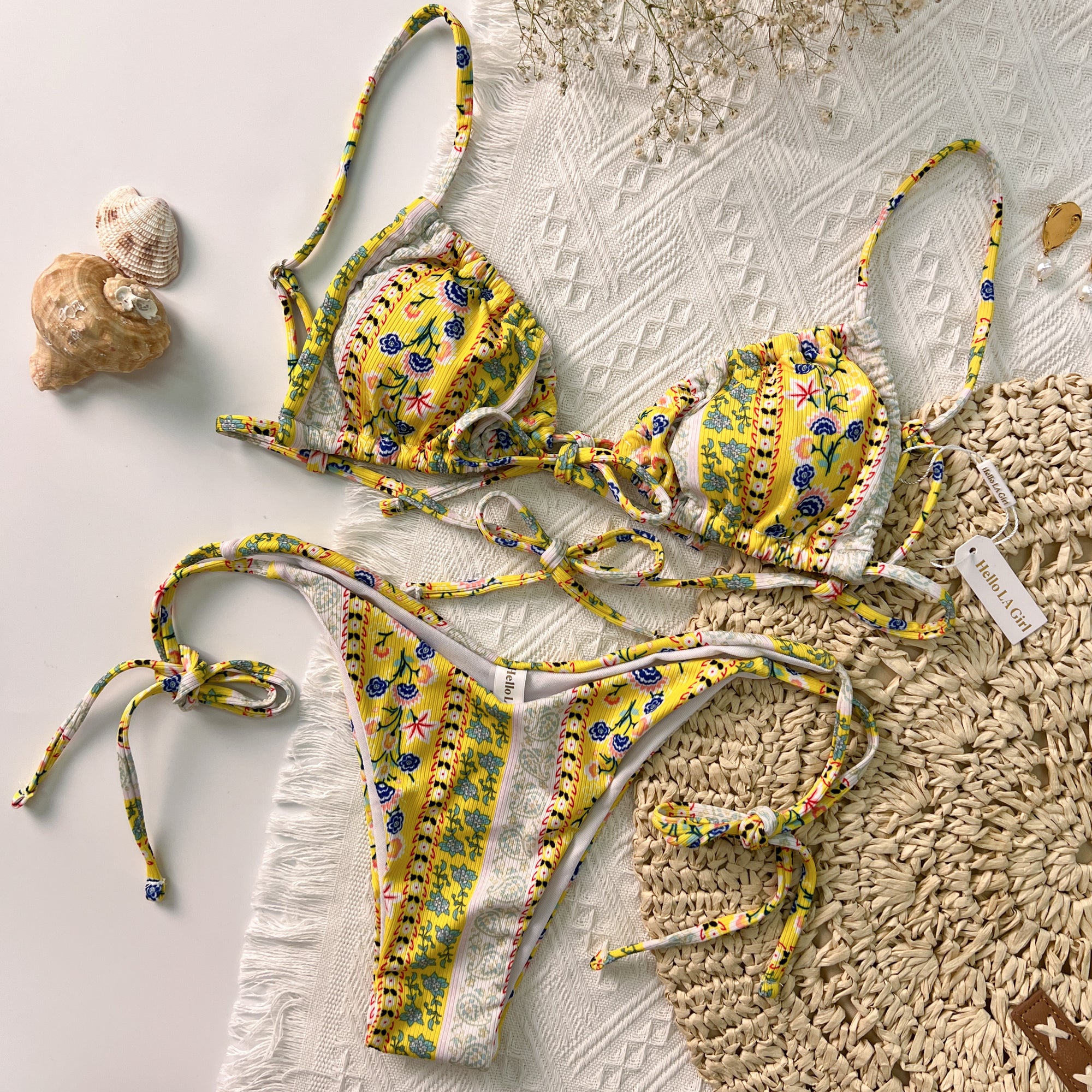 Ensemble de bikini à bretelles imprimé bohème jaune