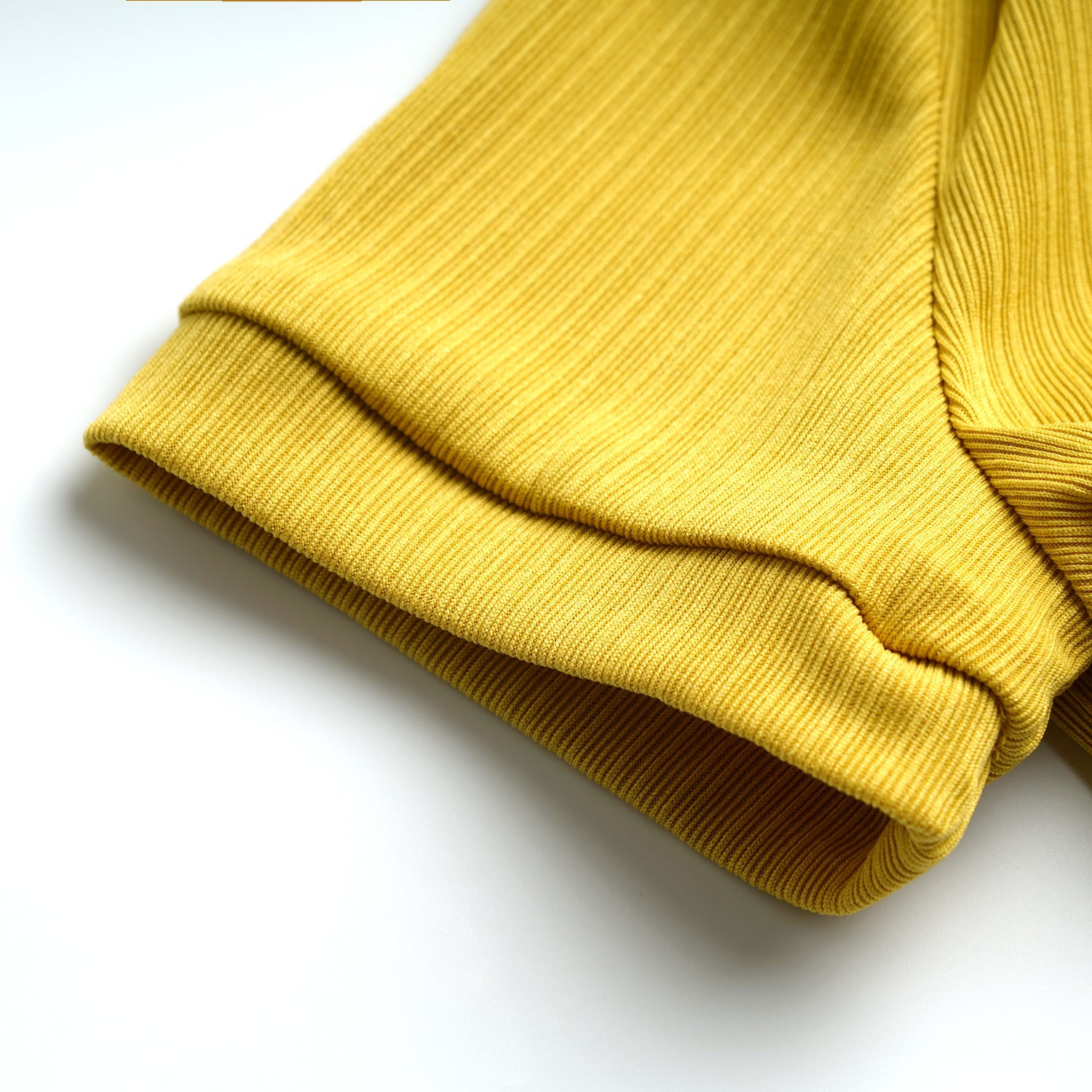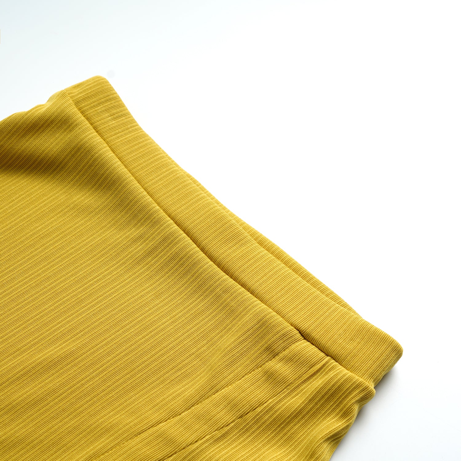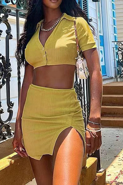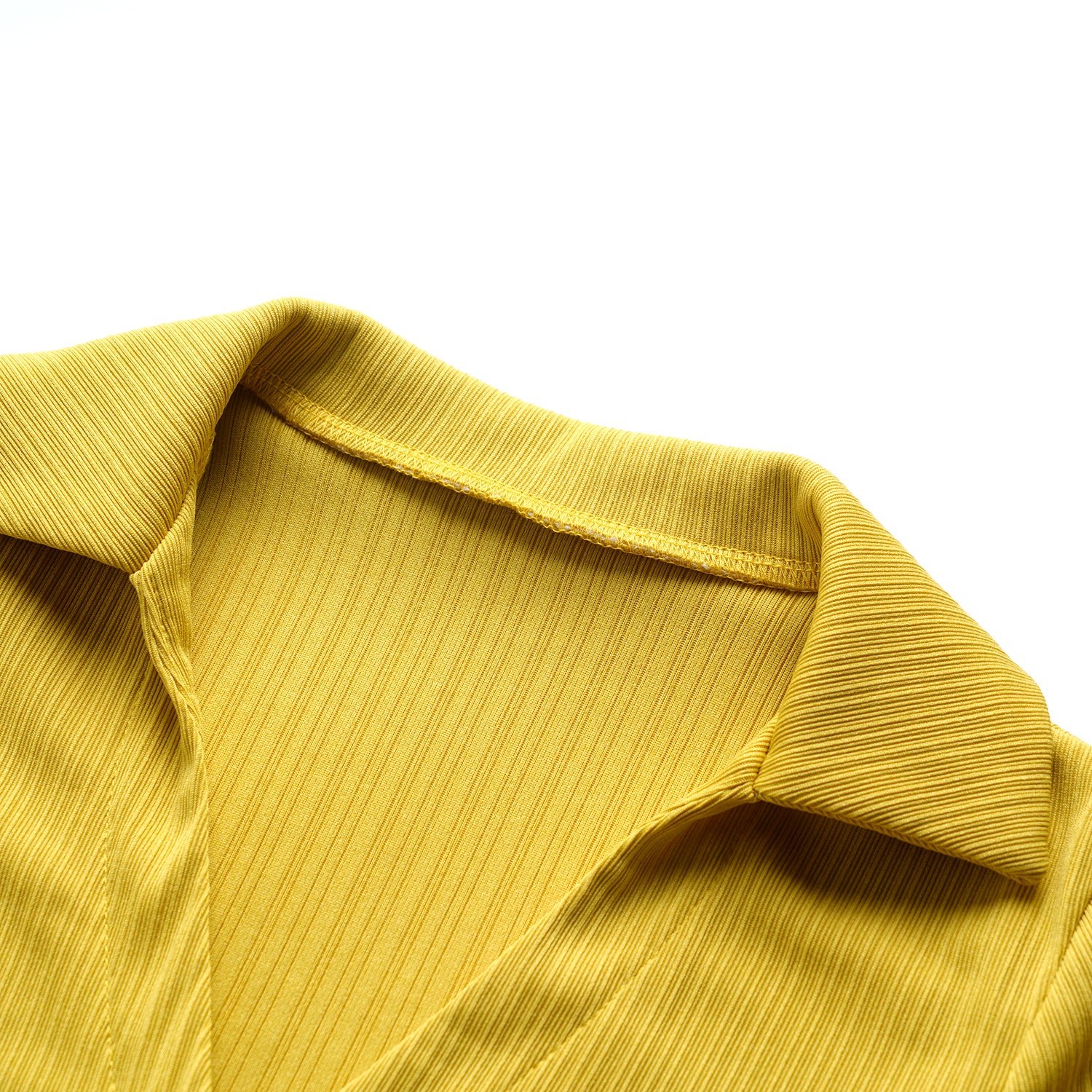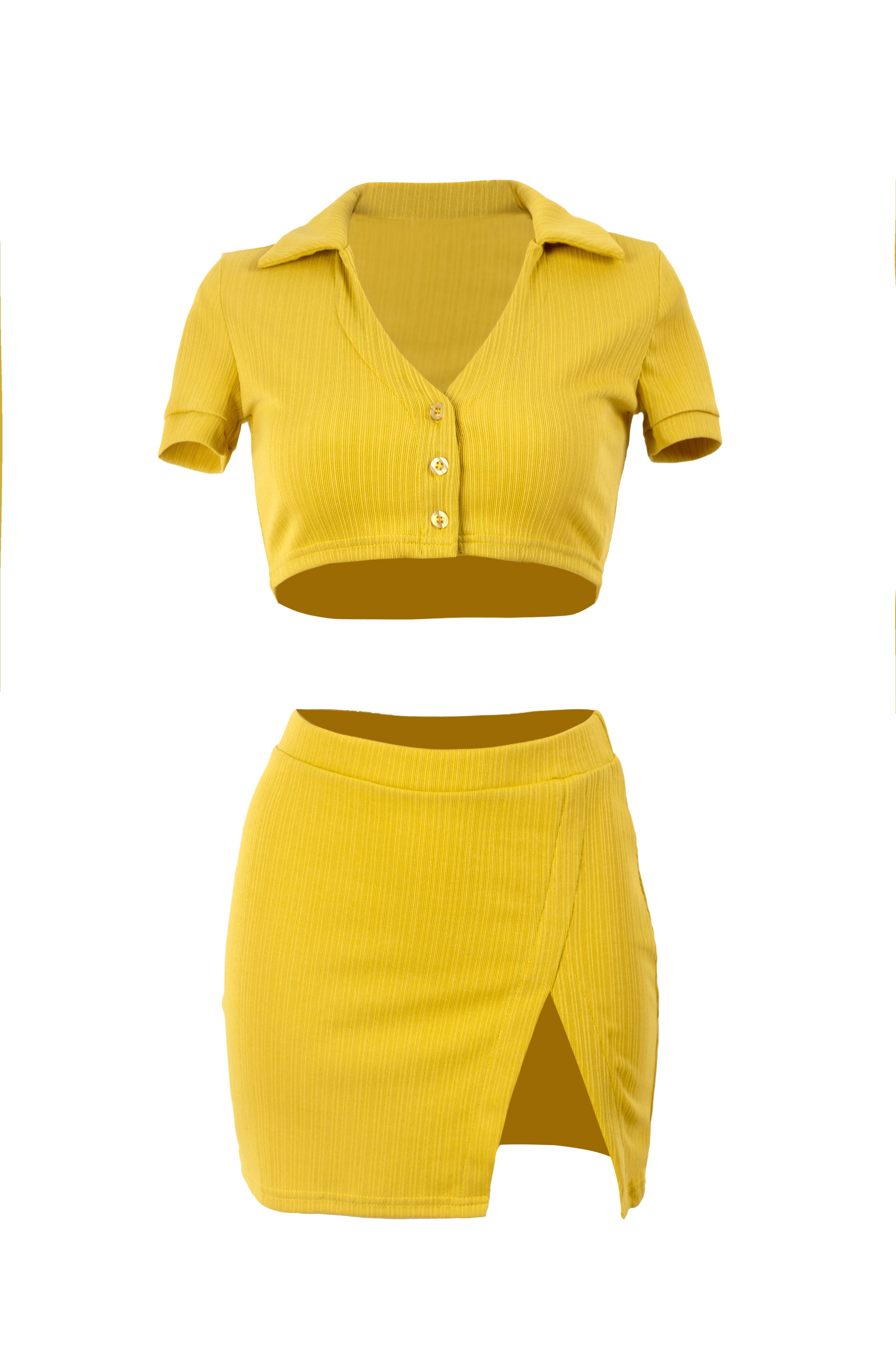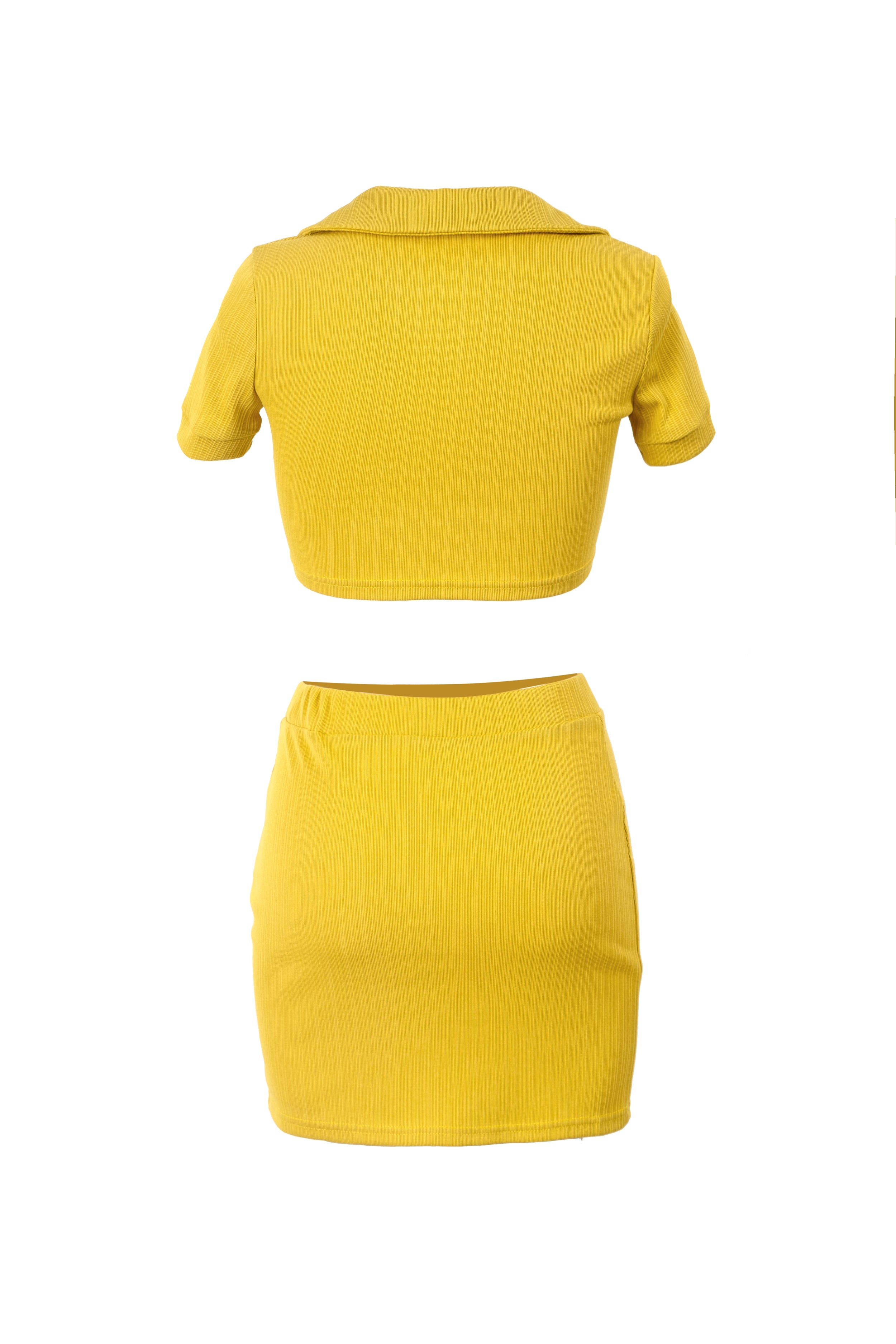 Haut court à boutons et col polo côtelé uni jaune avec mini-robe fendue