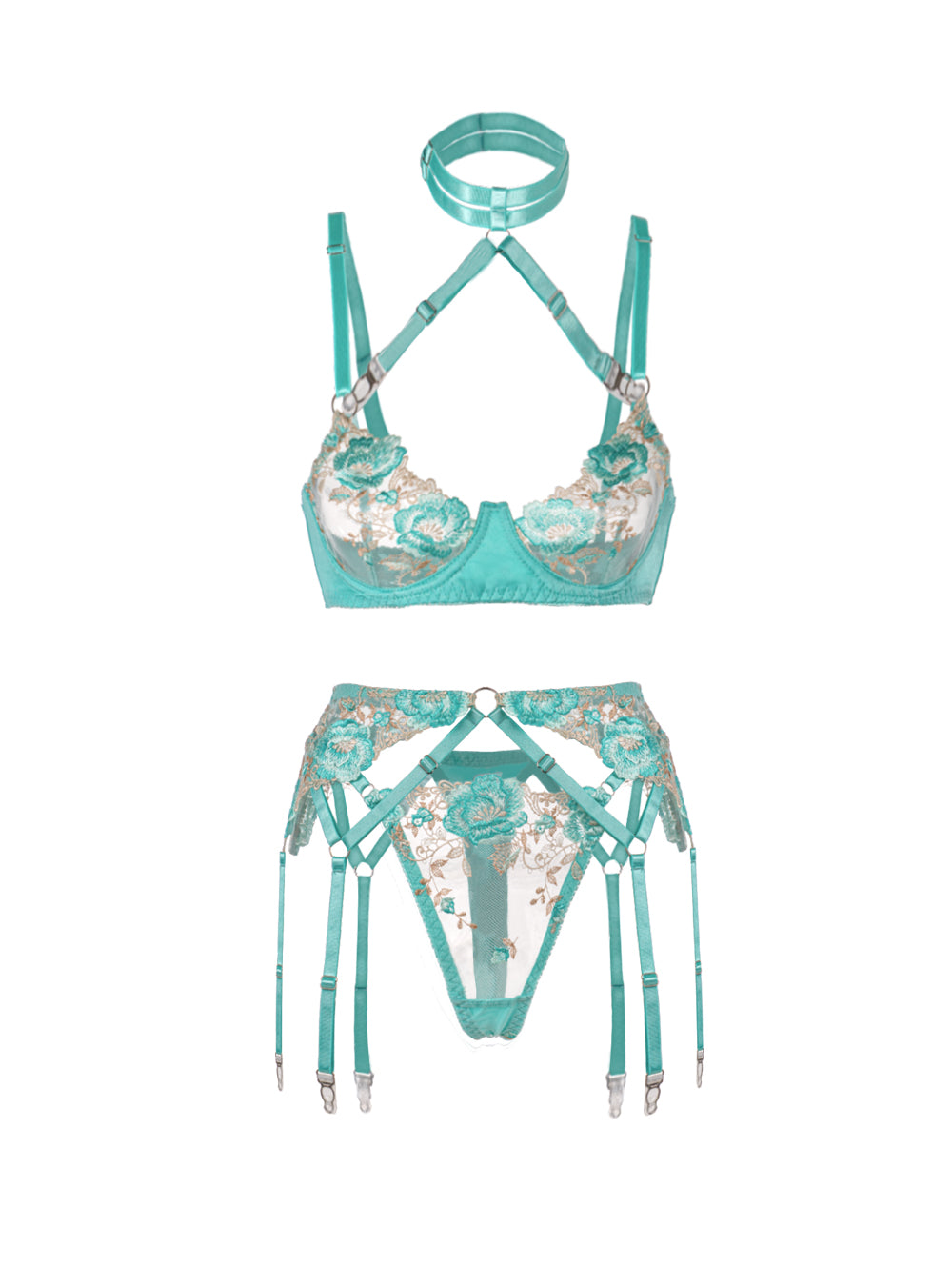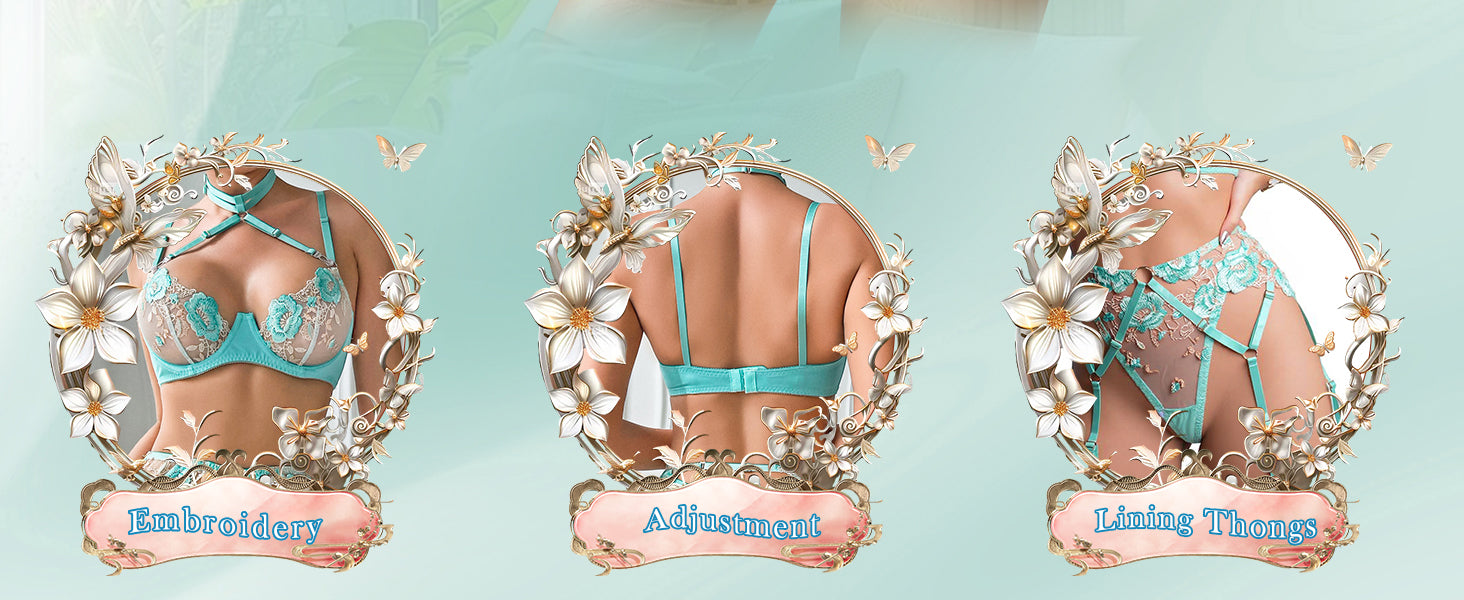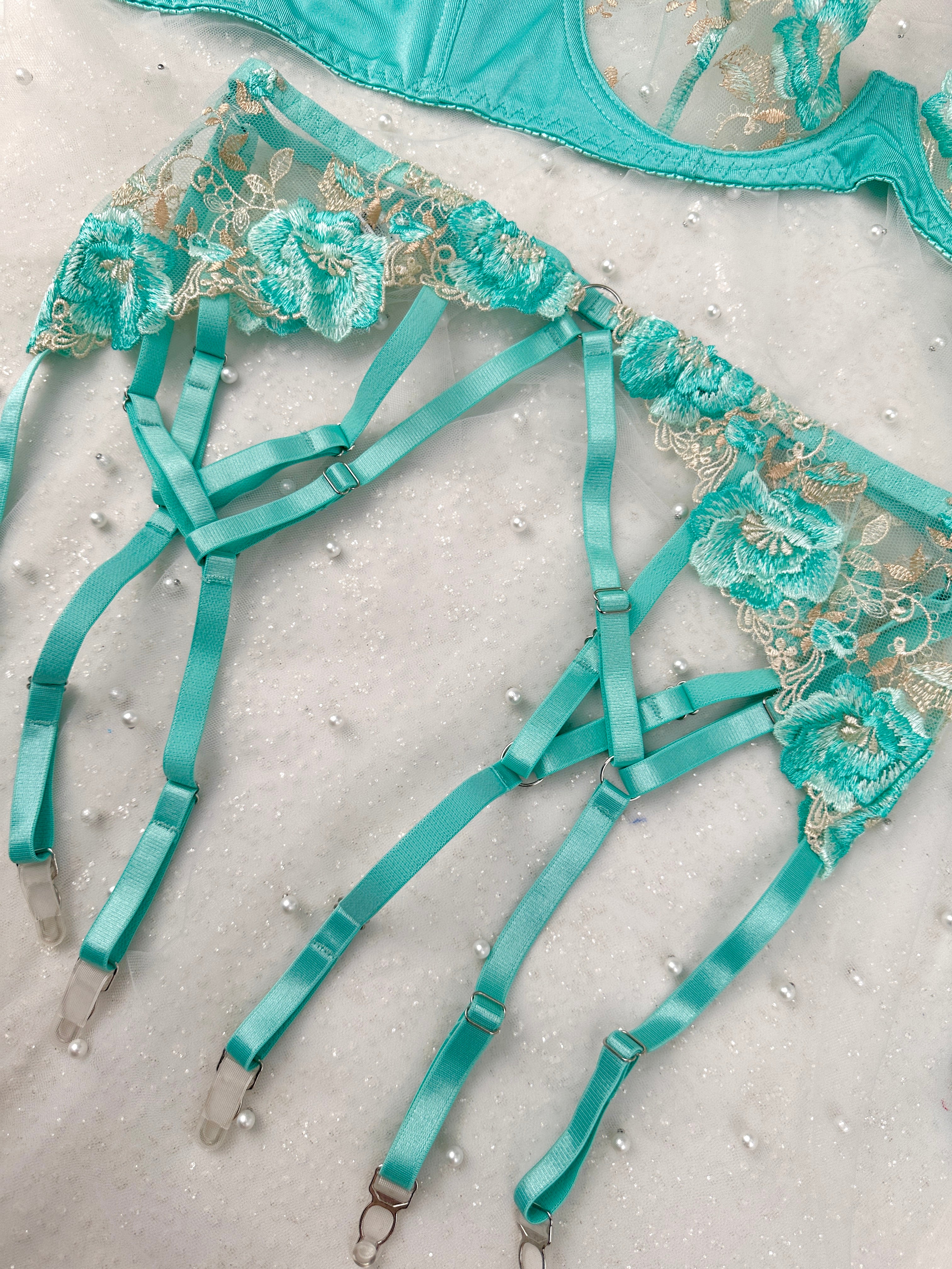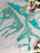 Turn heads with the Turquoise Floral Allure Lingerie Set, a stunning blend of elegance and sensuality. This set features a sheer mesh base adorned with delicate turquoise floral embroidery that adds a touch of romantic charm. The bra is designed with adjustable straps, a halter neck, and underwire support for a flattering lift, while the matching gartered panties showcase intricate strap details that accentuate your curves beautifully.