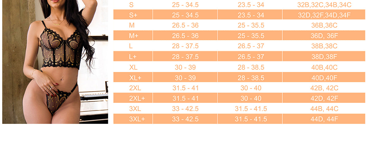 *Nous vous recommandons de prendre vos mesures avant de commander de la lingerie. Les différentes marques de lingerie utilisent des tableaux de tailles différents. Si vous souhaitez que l'ensemble de lingerie vous aille parfaitement, veuillez consulter le tableau des tailles ci-dessous.