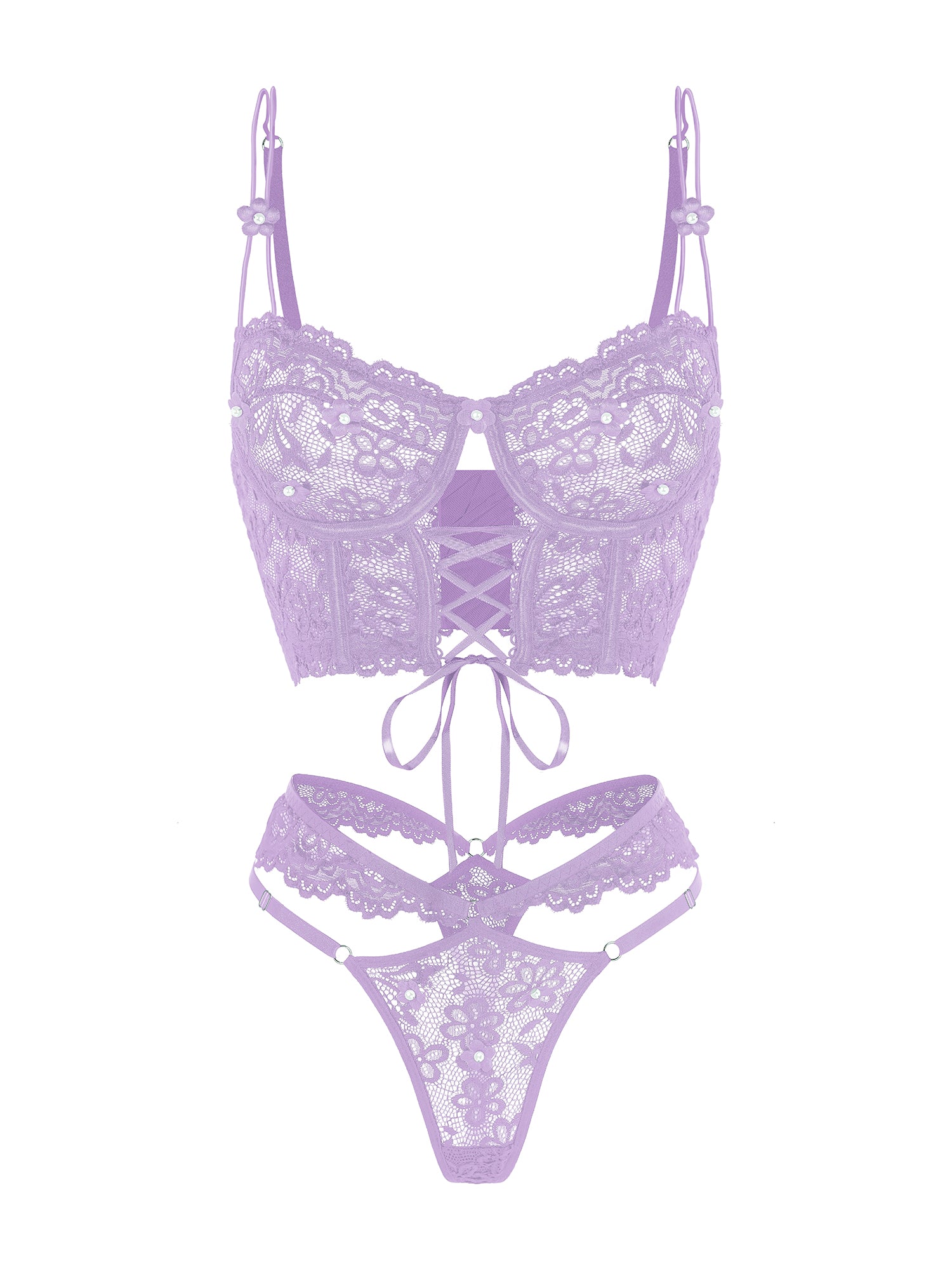 Embrace elegance in this lavender lace lingerie set, featuring 3D floral embroidery and pearl accents. The lace-up bralette and matching panties offer a romantic touch with satin ribbons, perfect for bridal nights, anniversaries, or special moments.